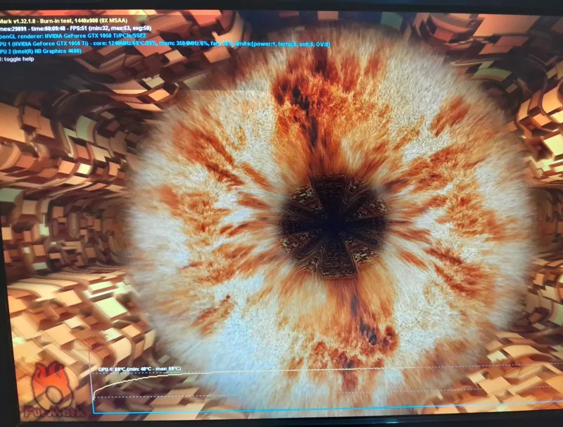 دمای کارت در تست فورمارک حدود 10 دقیقه به 69 درجه میرسه و نشان از سلامت عالی کارت گرافیک میباشد