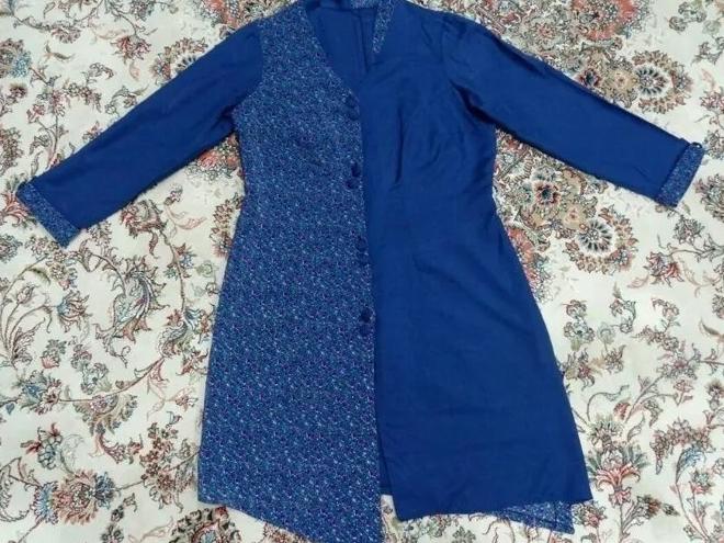 اندازه های مانتو آبی کاربنی( تصویر دوم) : قد 95 سانت ، دور سینه 94 سانت ، دور کمر 80 سانت ، دور باسن 105 سانت /مانتو استفاده شده هست کمی در کنارهای مانتو پوت های کوچیک داره که توی عکس نمیافتاد ولی گفتم توی تن اصلا مشخص نیست