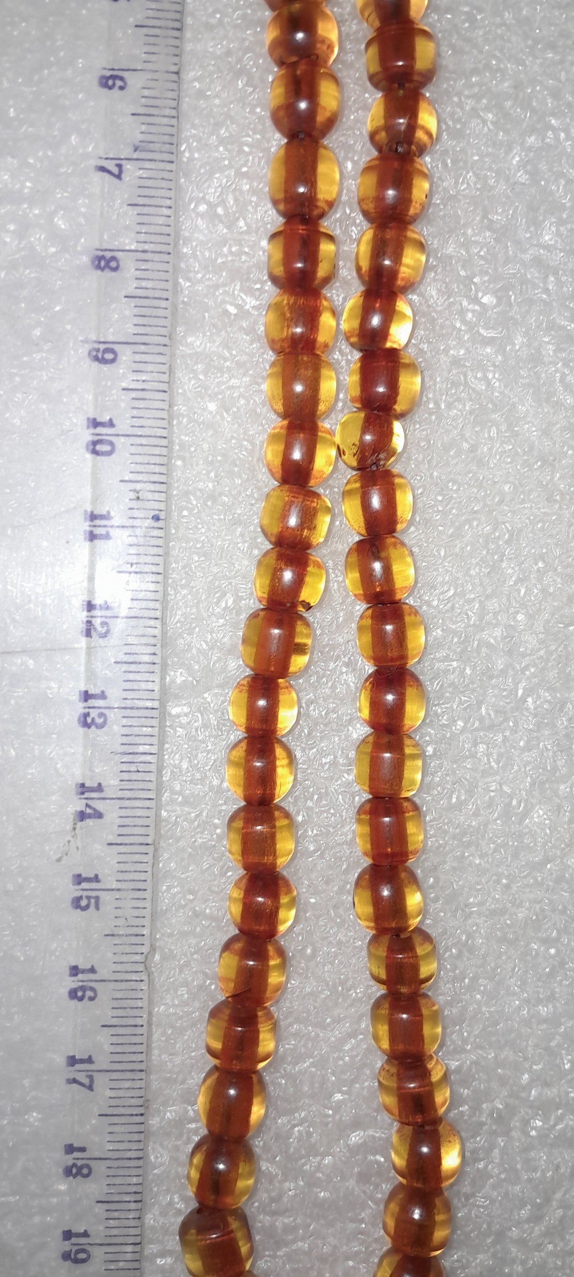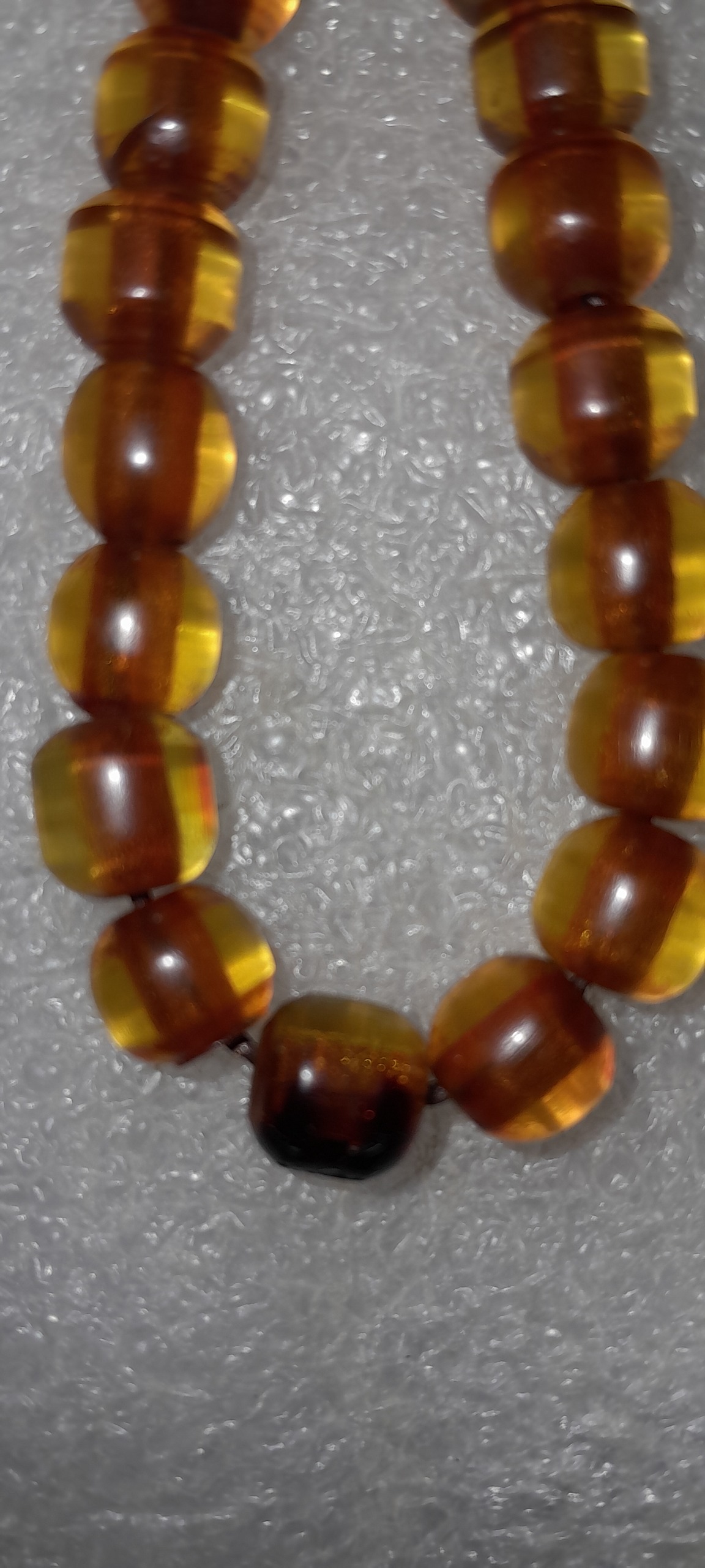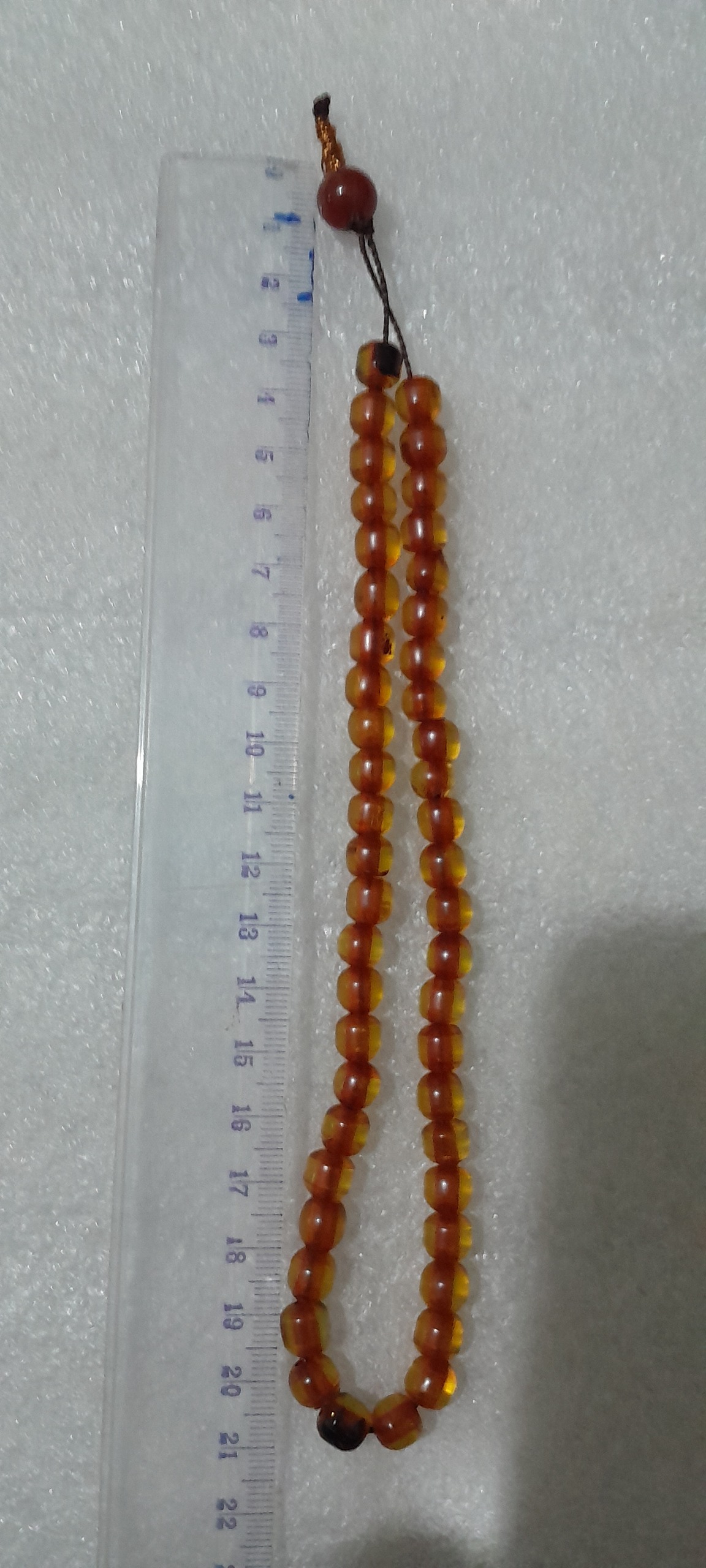 تسبیح یا مهرهای 46 عددی کهربا،دارای خاصیت در موقع تست حرارت تغیر رنگ داده و بوی صمغ از خود ترشح می کند و در هنگام مالش بین دو دست بوی خاص از خود ترشح می کند بسیار شفاف و چشم نواز قدیمی و در ضمن دو مهره رویش تست حرارت انجام شده.