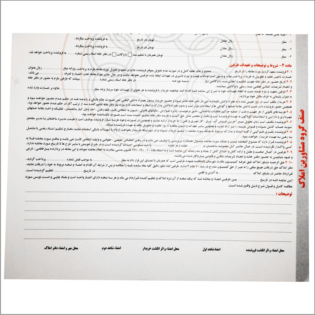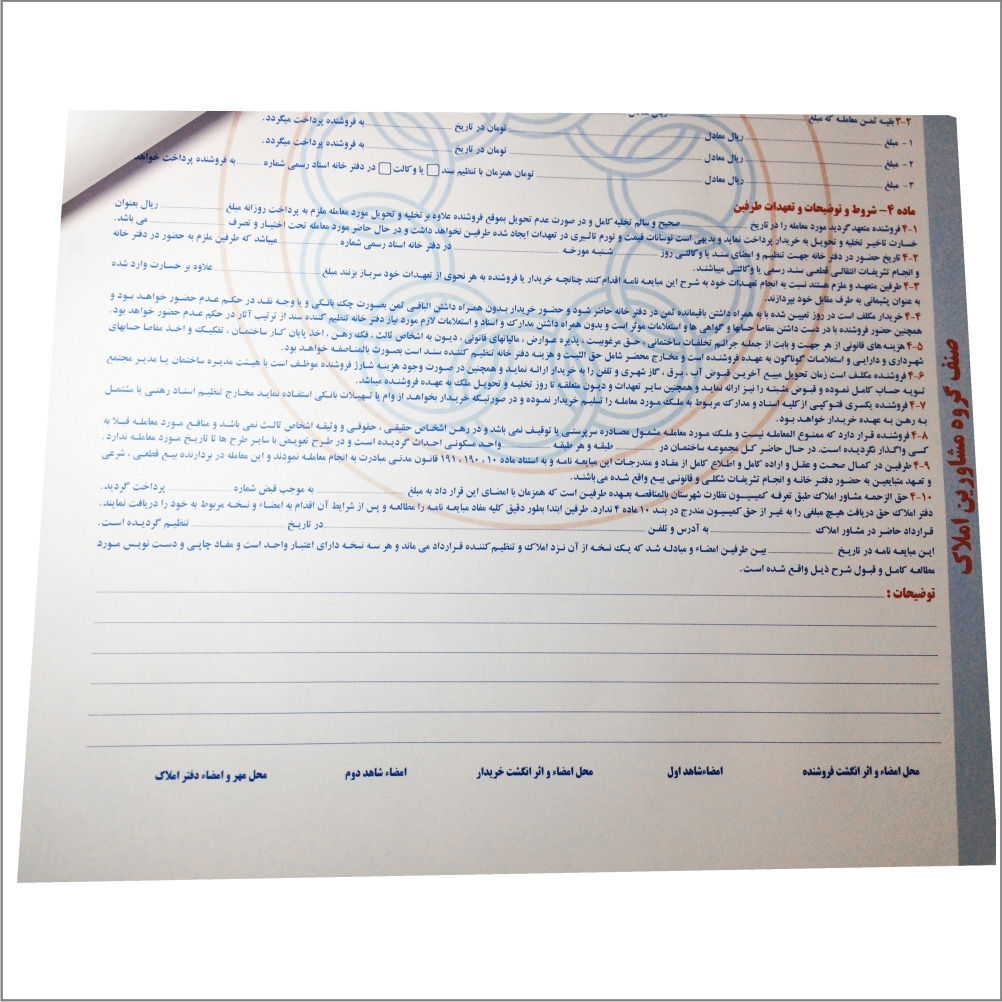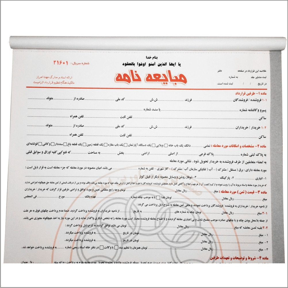 این مبایعه نامه دارای کاغذ تحریر 80 گرم می باشد و شماره گذاری این مبایعه نامه با رنگ قرمز چاپ شده است. این محصول به صورت افست چاپ می باشد و هر شماره دارای سه برگ می باشد 25 برگ 3 برگ = جمعا 75 برگ شماره ها با رنگ قرمز هر صفحه دارای رنگ چاپ متفاوت می باشد همه برگه ها پرفراژ خورده