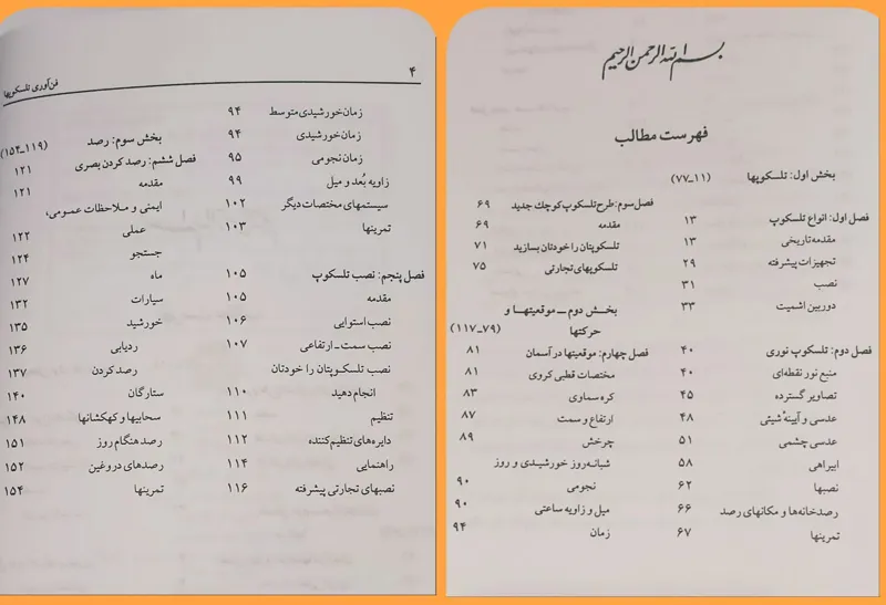 این کتاب حاوی اطلاعاتی در زمینه تلسکوپها، نحوه کارکرد، طرز استفاده آنها و چگونگی نصب کامل یک تلسکوپ از ابتدا تا پیدا کردن اجرام آسمانی می باشد و توضیحات کاملی در مورد زمان نجومی و خورشیدی، زاویه بعد، میل، اخذ نور، ابیراهی همراه با جزئیات کافی و مناسب برای