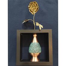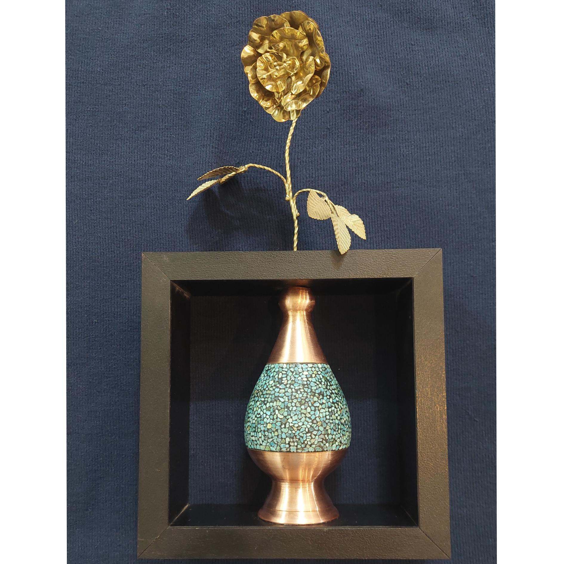 گلدان مسی فیروزه کوب همراه با چارچوب برای نصب روی دیوار و یک شاخه گل برنجی خوشگل