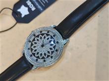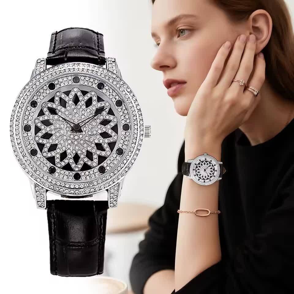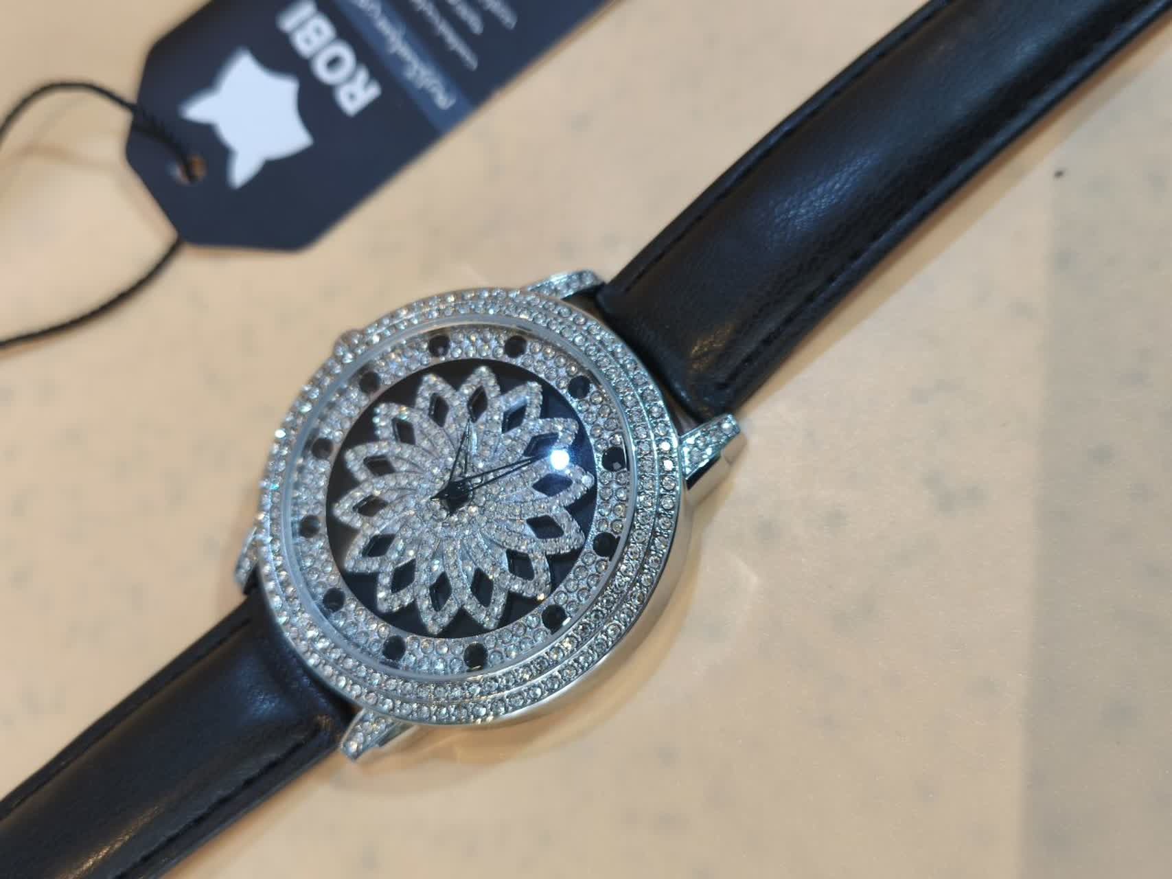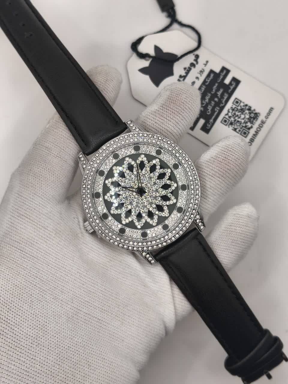 ساعت مچی زنانه رینگی چرخشی با بند چرمی باکیفیت رنگ مشکی و صفحه نقرهای طراحی دایرهای و صفحه متحرک با حرکت دست مجهز به موتور کوارتز با دقت بالا و صفحه فول نگین قاب استیل و شیشه معدنی ضد خش سافایر بند چرمی دور دوخت ضد حساسیت پوستی