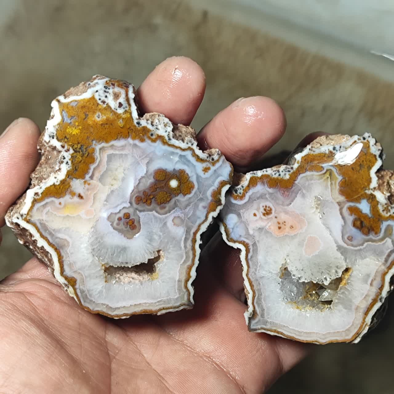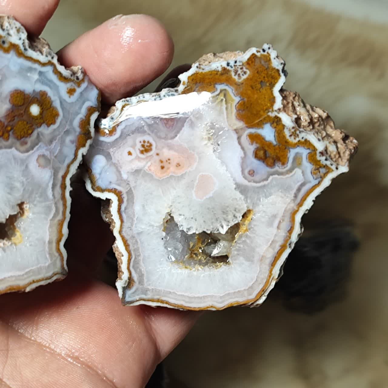 این سنگ دقیقا شبیه دو تا زامبی هست که دارن میخندن این جفت یه سنگ کاملا کلکسیونی هستش این عقیق به طور خاصی از چند نو عقیق و کوارتز مختلف با هم دیگه همرشدی پیدا کردن داخل این تیکه از عقیق شجر پاییزه وجود داره تا عقیق مادر و هم رشدی با کوارتز و بلور ریز امیتیست با هم دیگه هم رشدی داشتن همه اینا با هم دست به دست هم دیگه دادن تا این شاهکار هنری ایجاد شده بهترین نقاش دنیا فقط خداس اینم یکی از شاهکار های خودشه