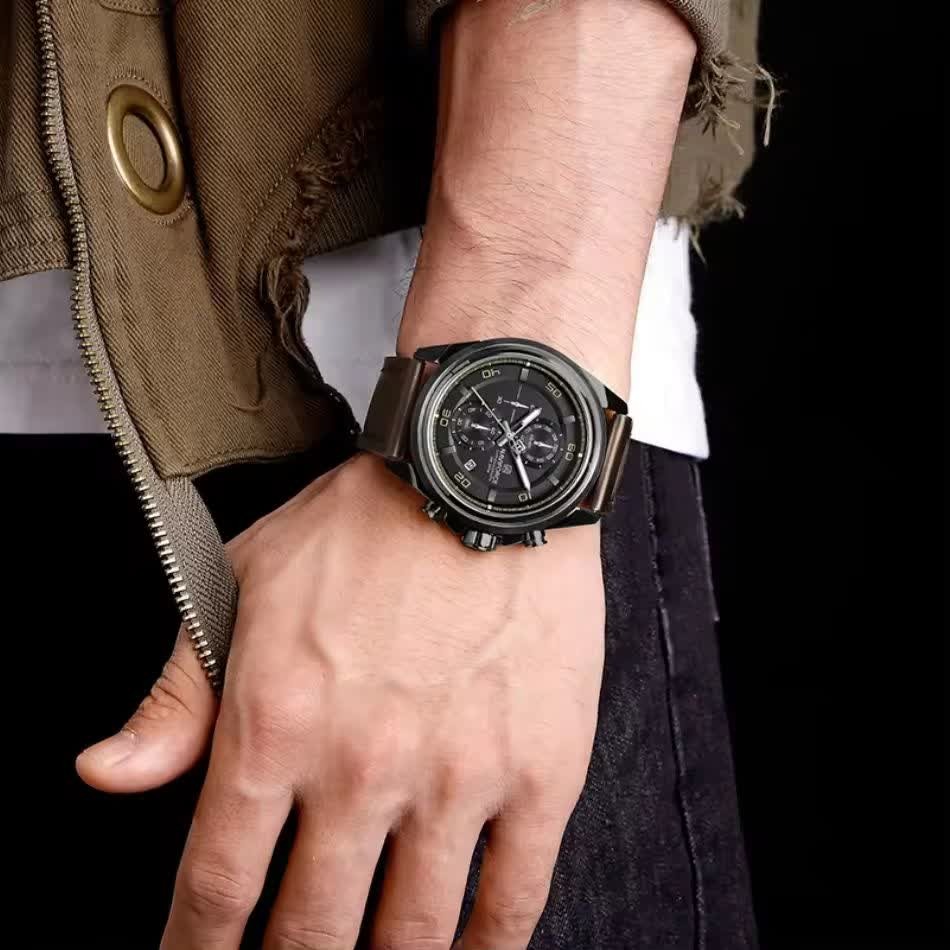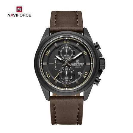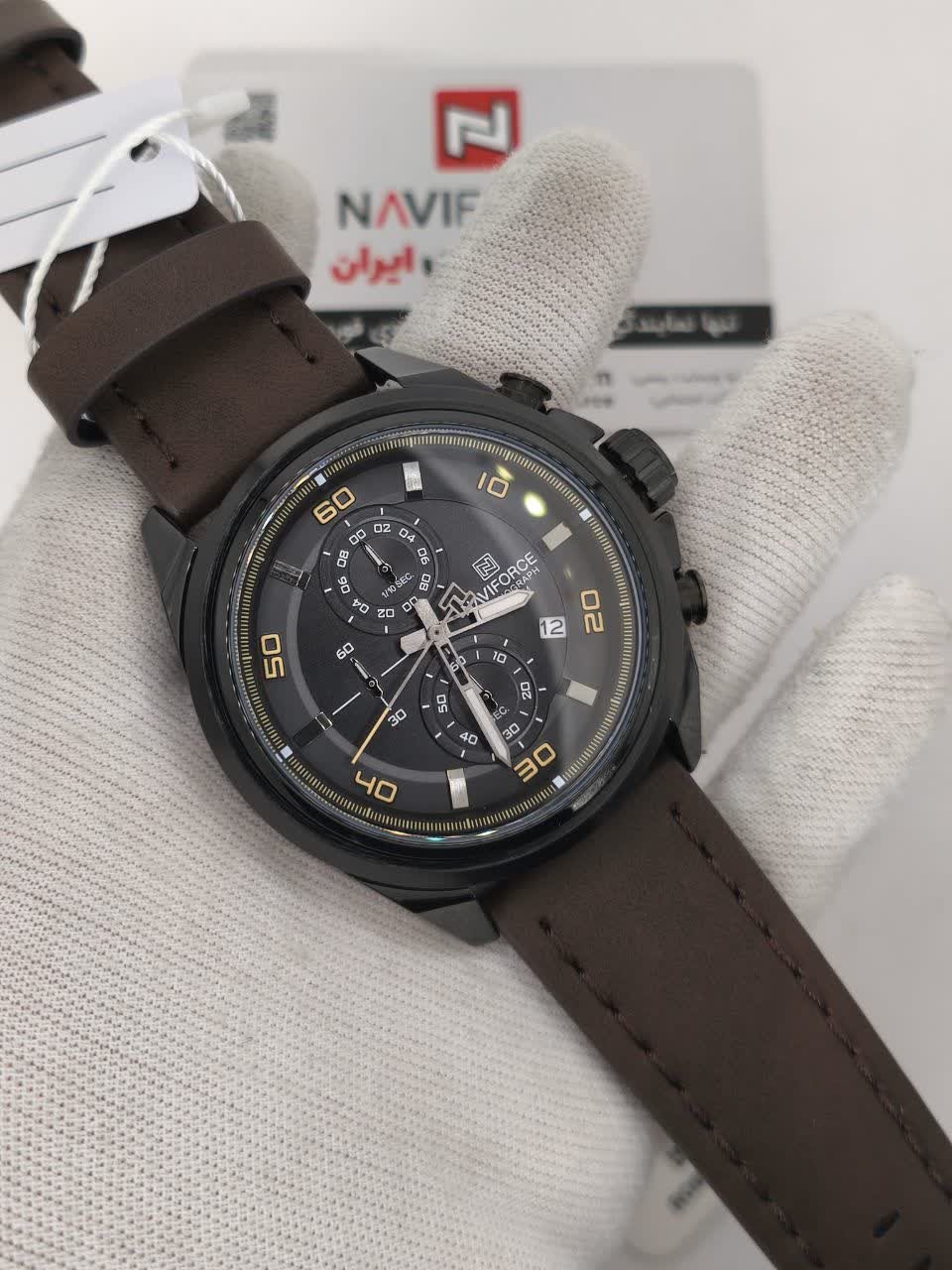 ساعت مچی کرنوگراف مردانه نیوی فورس NAVIFORCE مدل NF8075 با موتور ژاپن انتخابی قدرتمند و حرفهای برای آقایان خوش استایل است. این مدل با بند چرم قهوه ای اصلی و باکیفیت دور دوخت و ضد حساسیت پوستی به همراه صفحه دایره ای مشکی جلوهای