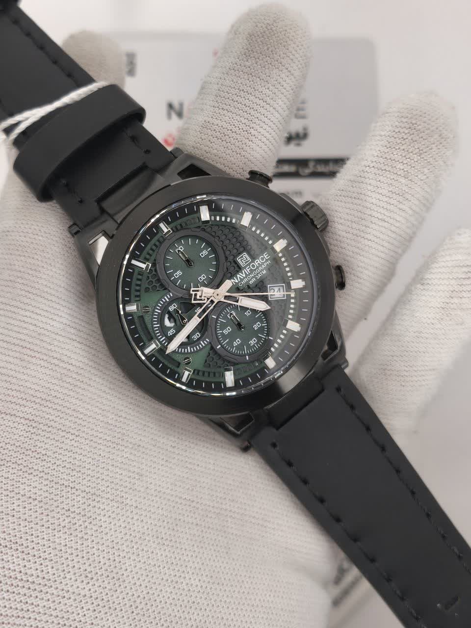 ساعت مچی کرنوگراف مردانه نیوی فورس NAVIFORCE مدل NF8075 با موتور ژاپن گزینهای حرفهای و خاص برای آقایان خوش سلیقه است. این ساعت با بند چرم مشکی اصلی و باکیفیت دور دوخت و ضد حساسیت پوستی و صفحه دایره ای با ترکیب رنگ سبز تیره و مشکی