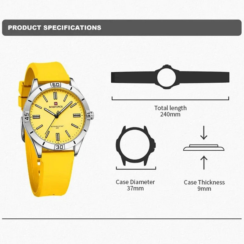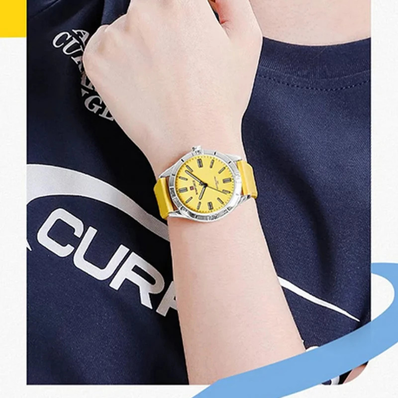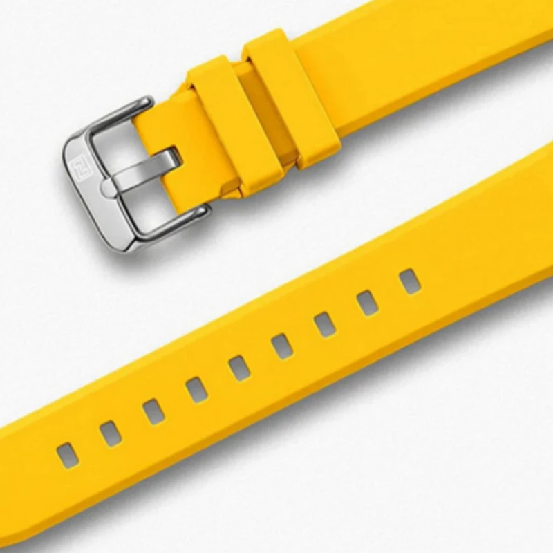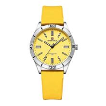 بدنه استیل نقره ای براق با بند سیلیکونی نرم و ضخیم به رنگ زرد