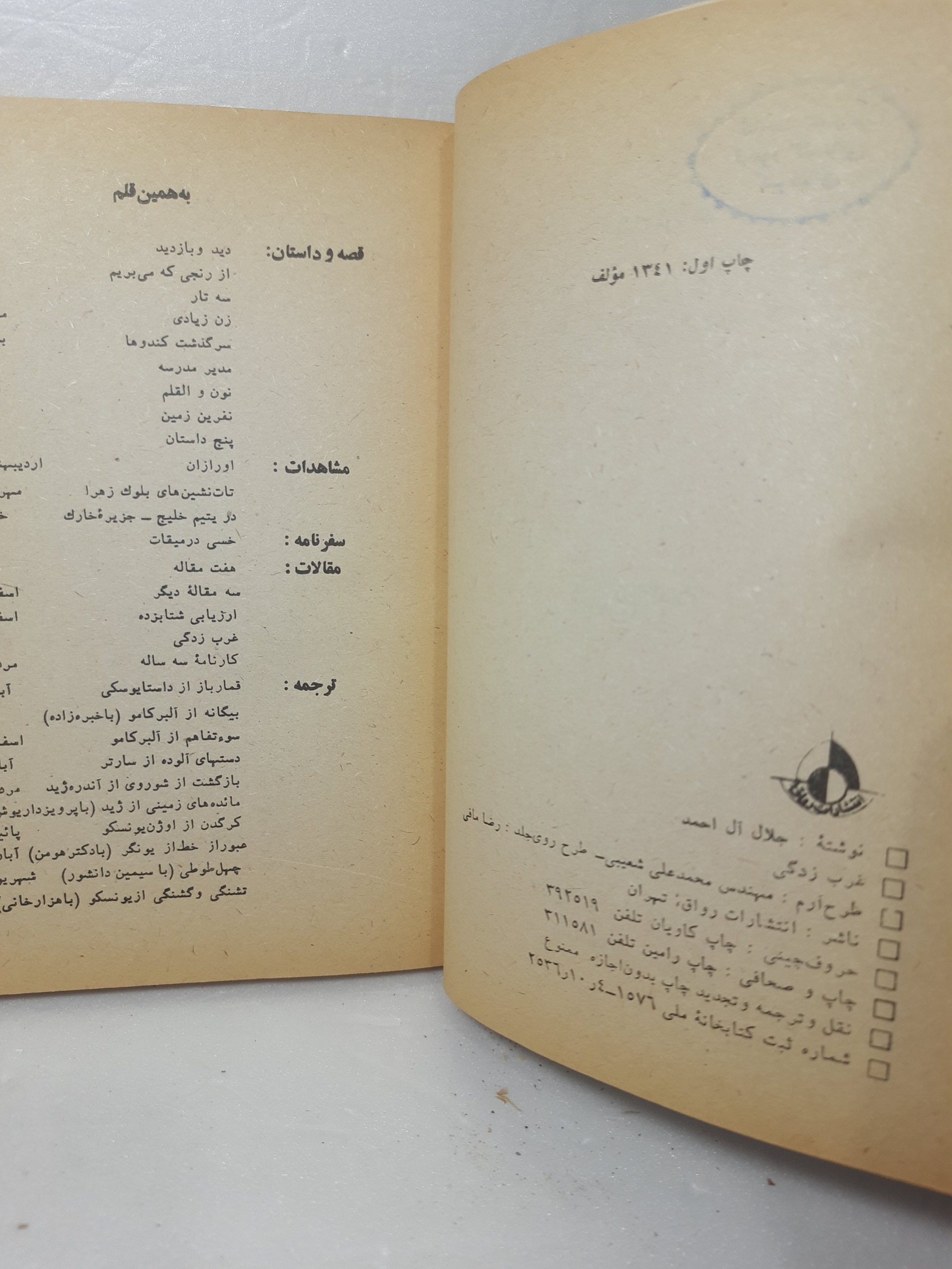 کد 2071 غرب زدگی از جلال آل احمد انتشارات رواق چاپ سال 2536 شاهنشاهی ر 230 صفحه جلد و صفحات سالم میباشد جلد دارای زدگیهای جزئی برخی از صفحات مهر خوردگی دارد