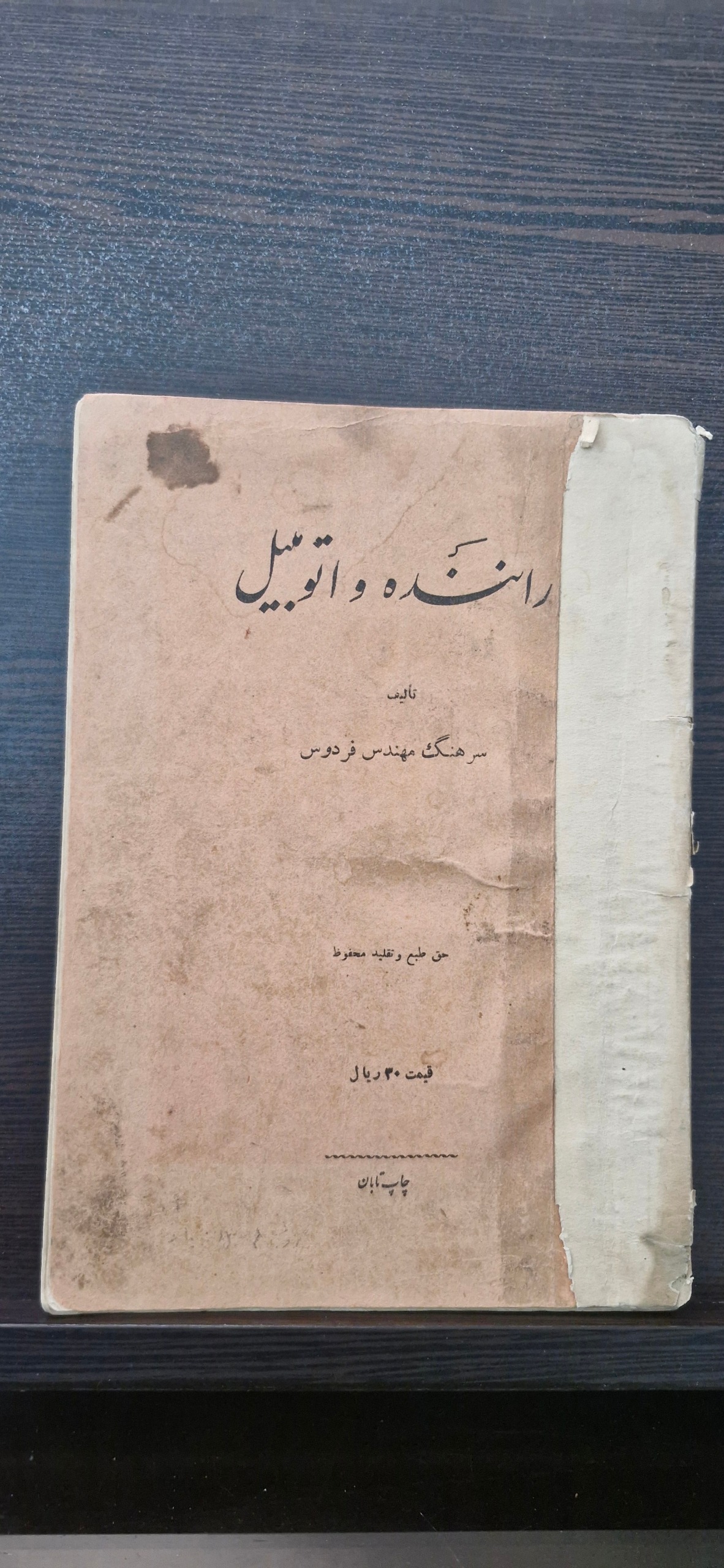 کتاب قدیمی راننده و اتومبیل چاپ دهه20 کم آ خوردگ دار هست 62 صفحه با علائم راهنمایی و رانندگی خریدار محترم لطفا با دقت به توضیحات هر کالا دقت بفرمایید کالاها کیفیت شان مطابق با تصویر هست و انواع کتاب، مجله، روزنامه، اسناد و عکسهای قدیمی از دوره قاجار