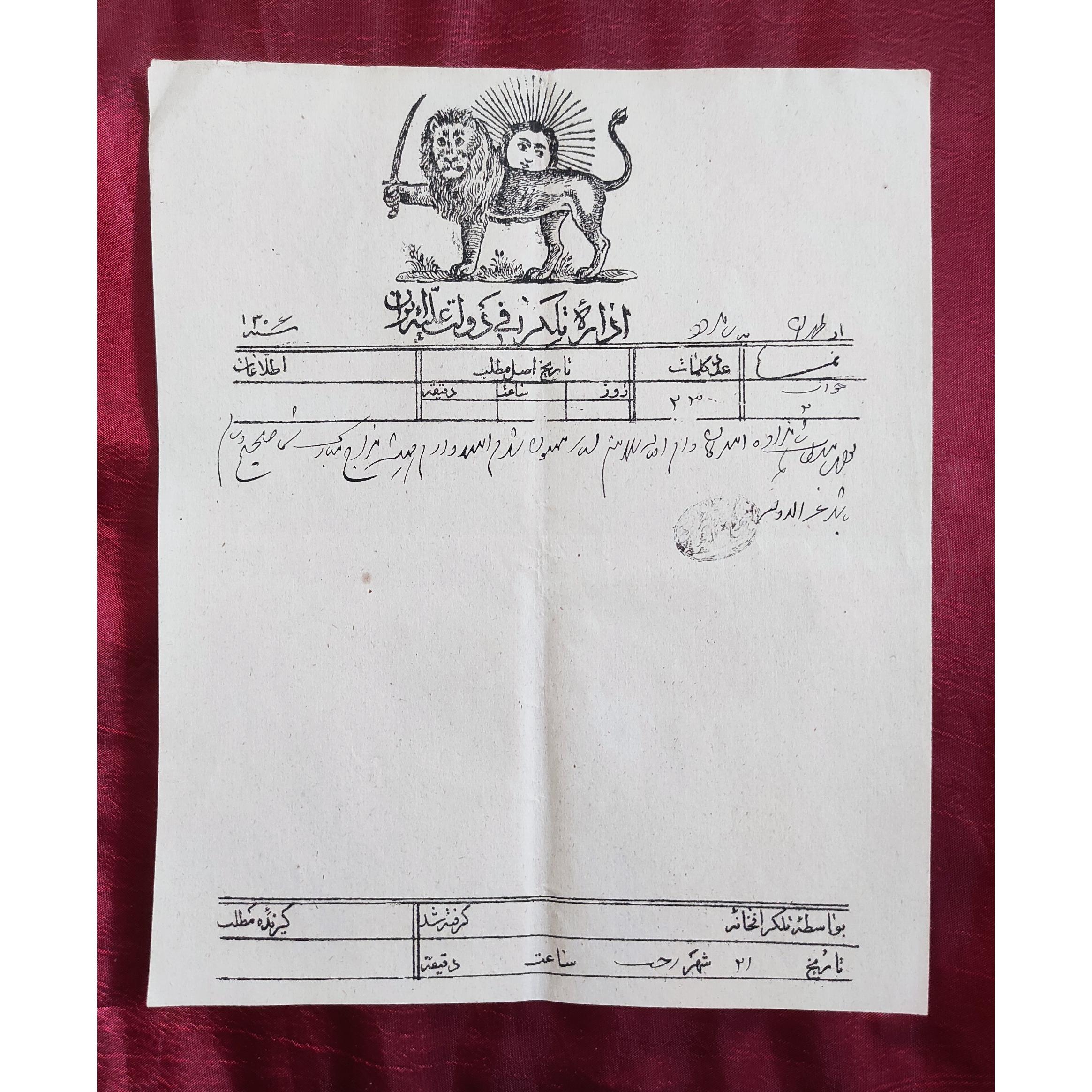 تلگراف شیر بزرگ یک شاهزاده (عبدالصمد میرزا عزالدوله فرزند محمد شاه قاجار) به شاهزاده ی دیگر (حضرت والا امیر تومان فرزند فتحعلی شاه)