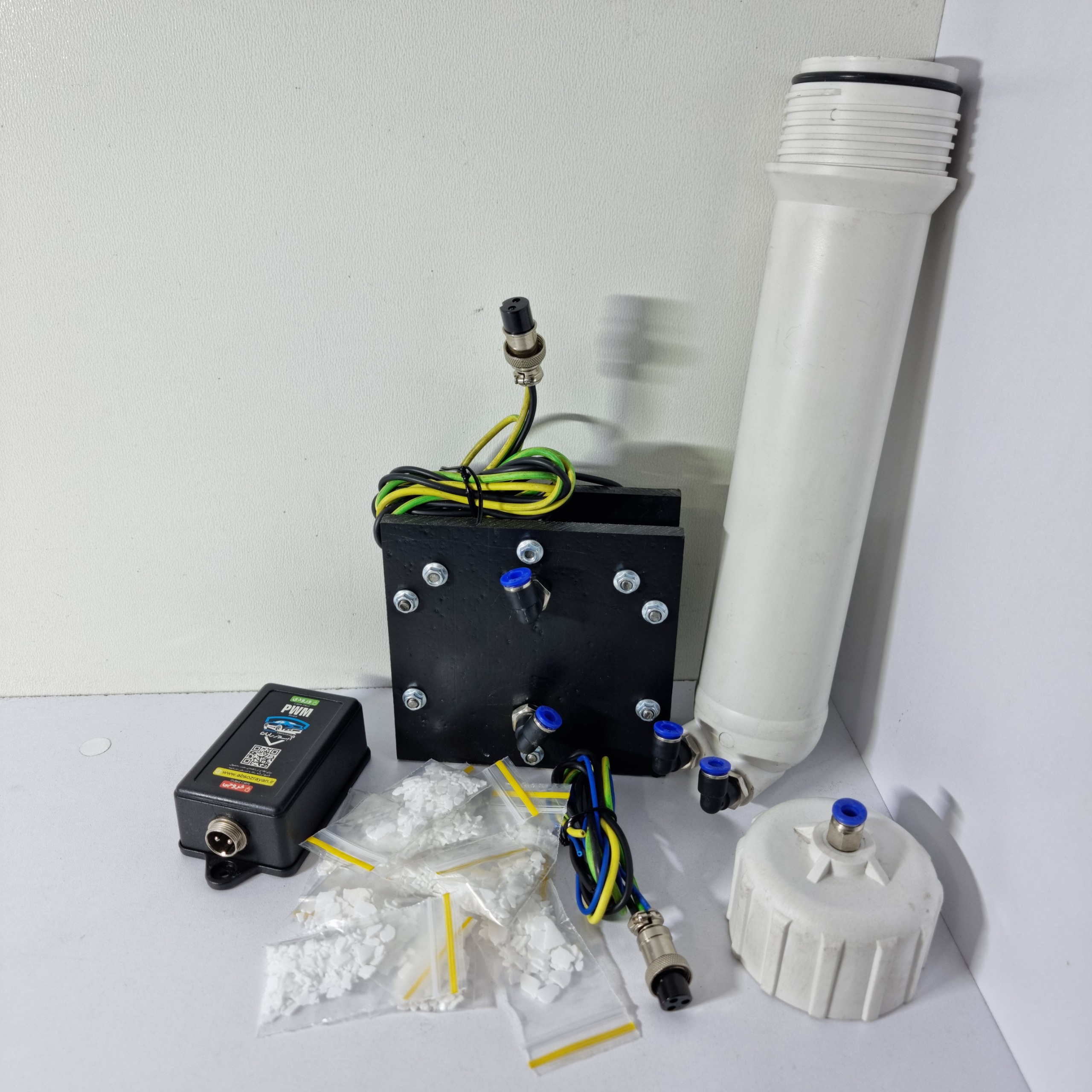 این دستگاه با برق 12 ولت خودرو، آب را به دو گاز هیدروژن و اکسیژن (HHO) تبدیل کرده