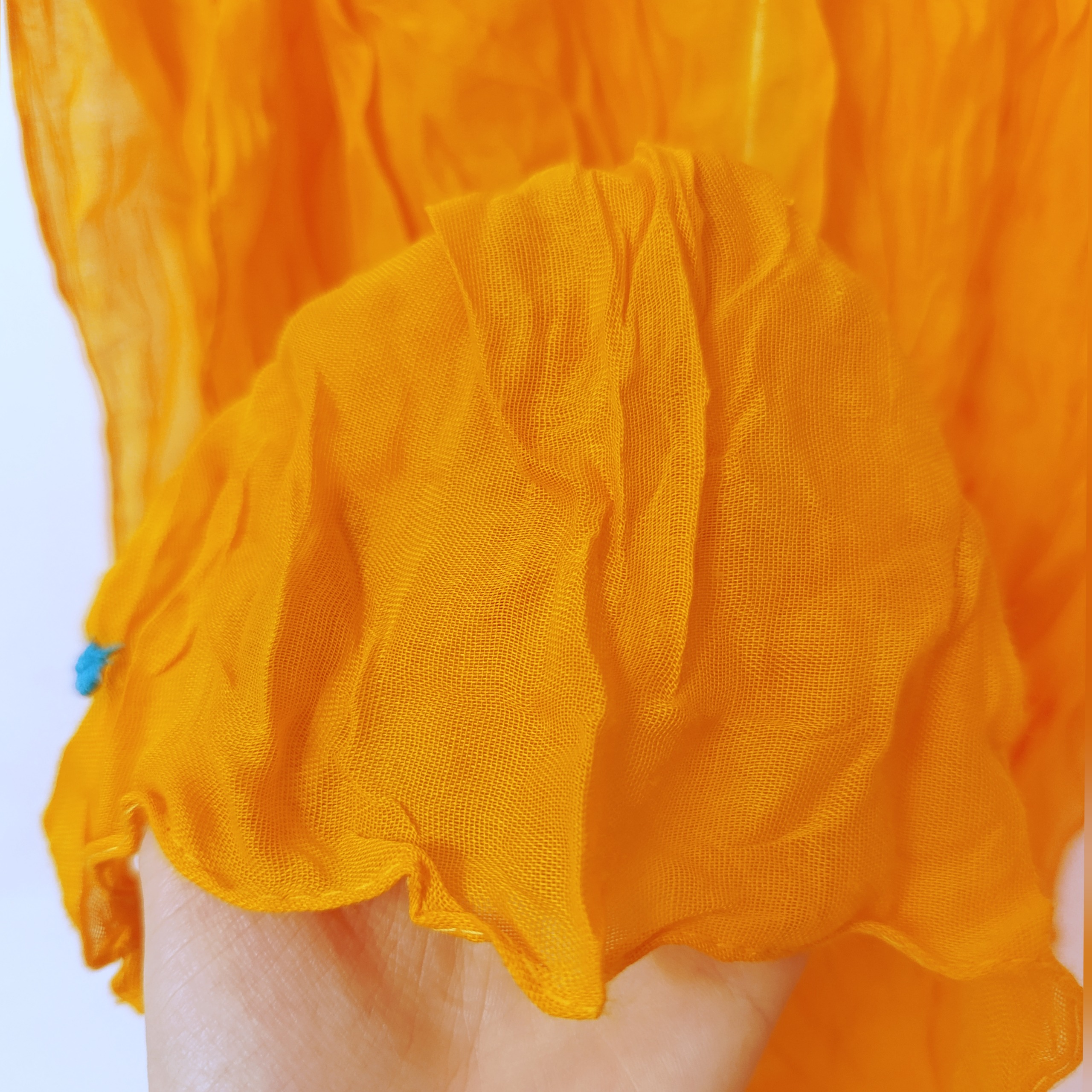 شال چروک ،رنگ نارنجی پرتقالی خوشرنگ ،یه طرفش دوتا گوشه ش گوگولی آبی دوخته شده ،کاملا نو و اصلا استفاده نشده ،قواره ش رو دقیق نمیشد بزنم ولی تقریبا در حالت صاف شده 70×170 سانت هست