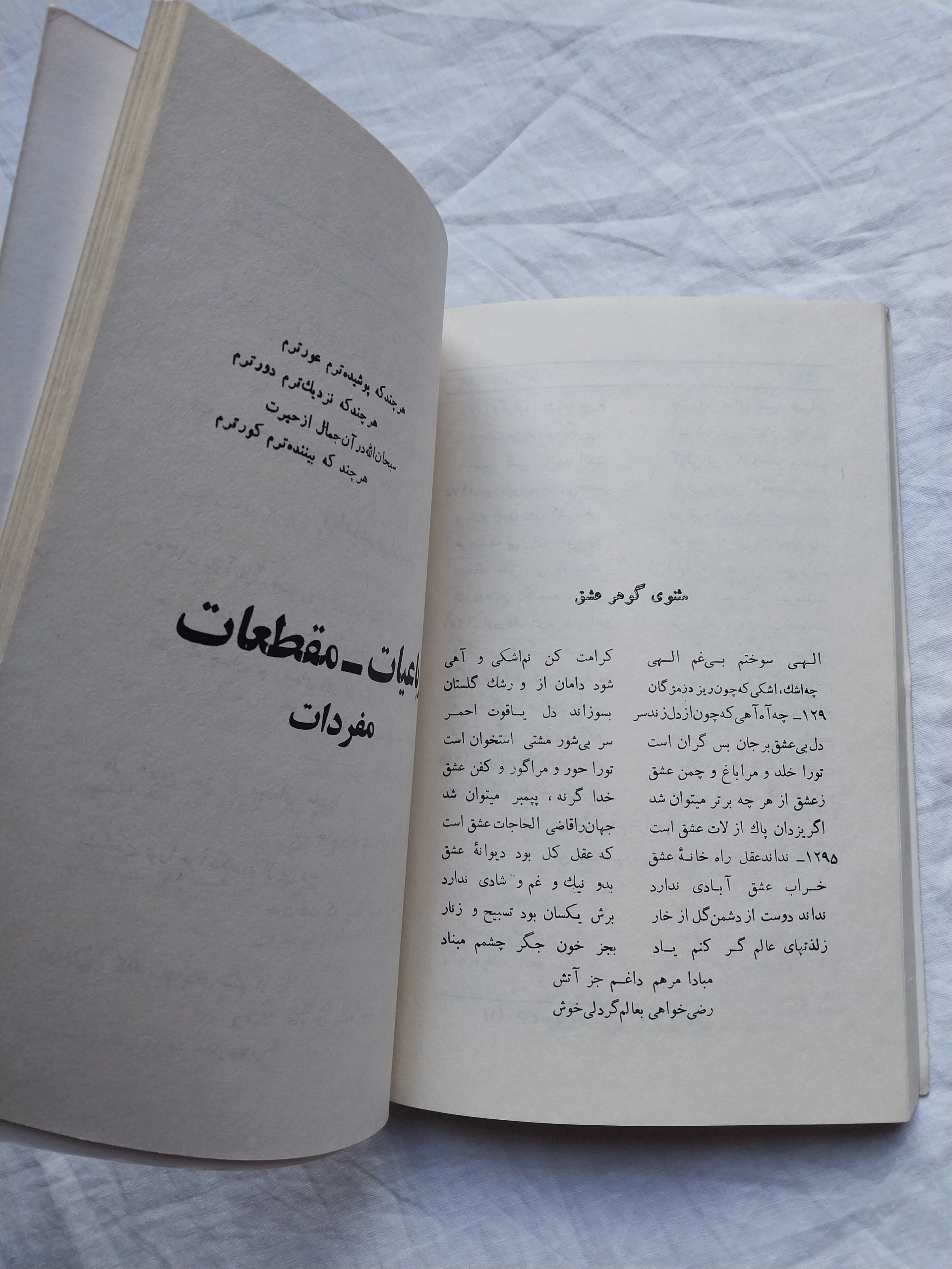 مشتمل بر ساقی نامه و سوگند نامه، غزلیات، قصائد، رباعیات، مقطعات و مفردات