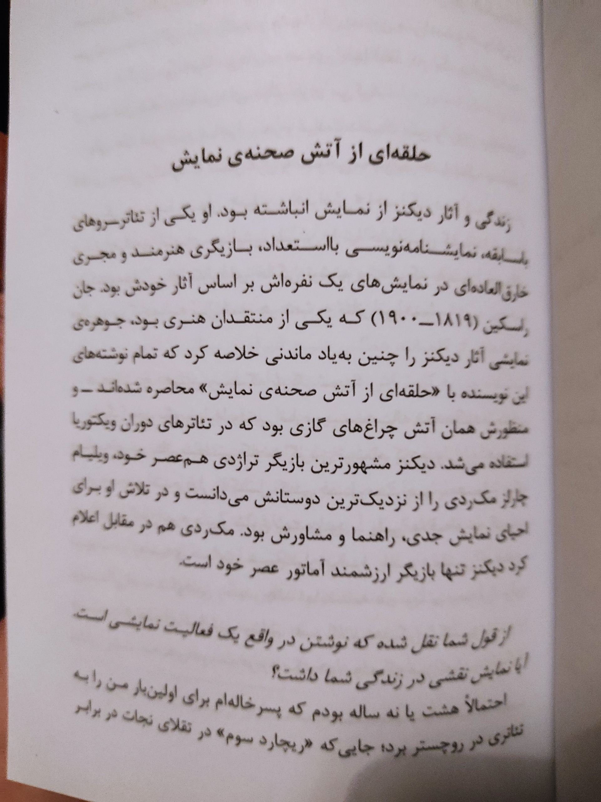 دیکنز (18121870م) نویسندة انگلیسی و خالق آثاری چون دوست مشترک ما؛ راز ادوین درود است. این گفتوگو شامل پانزده موضوع میشود که داستان زندگی، دستاوردها و روابط دیکنز را با دیگر شخصیتهای برجسته آشکار ساخته و اعتقادات و اندیشههای وی را بررسی میکند.