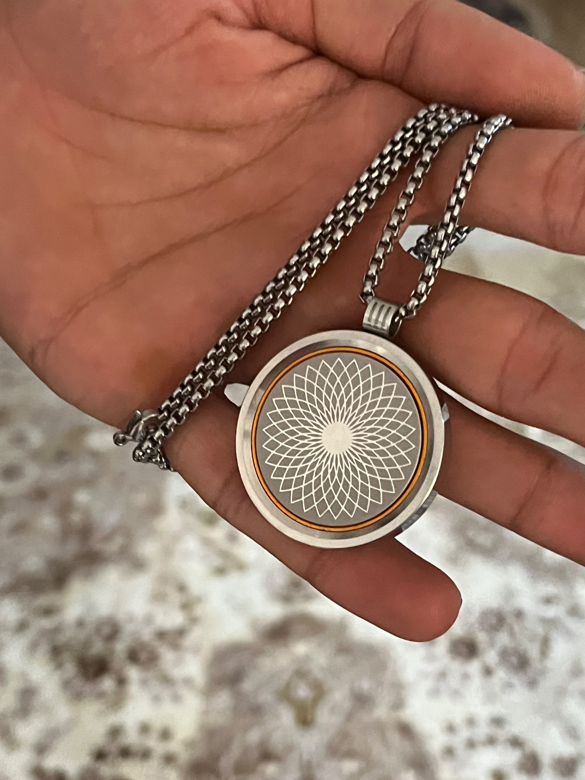 اویز تشکیل شده از چیپ کوانتومی( داخل اویز)ساخته شده از 230 نوع ماده از جمله مس و آلیاژ الومینیوم به کار رفته در ساخت فضاپیماها.این گردنبند امواج الکترو مغناطیس مضر را کاملا دفع میکند.
