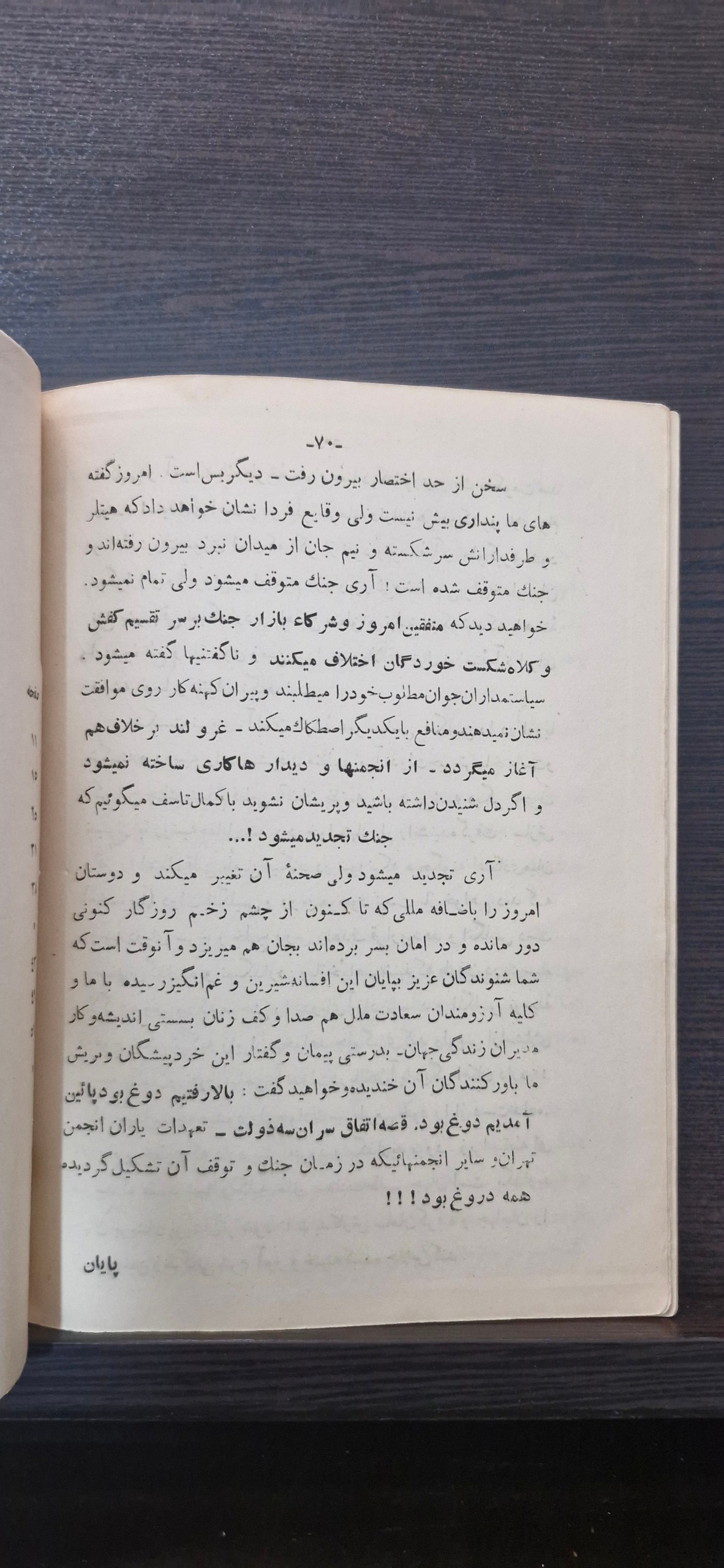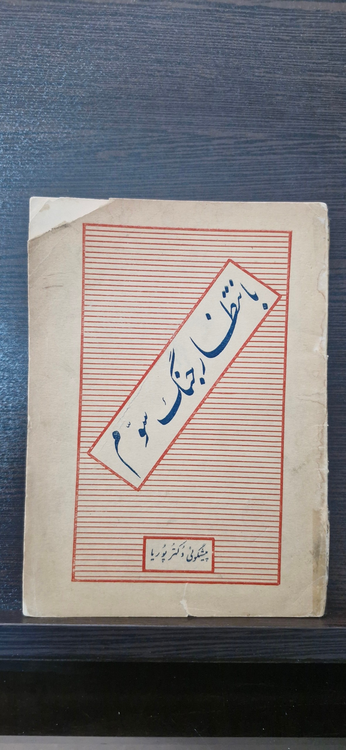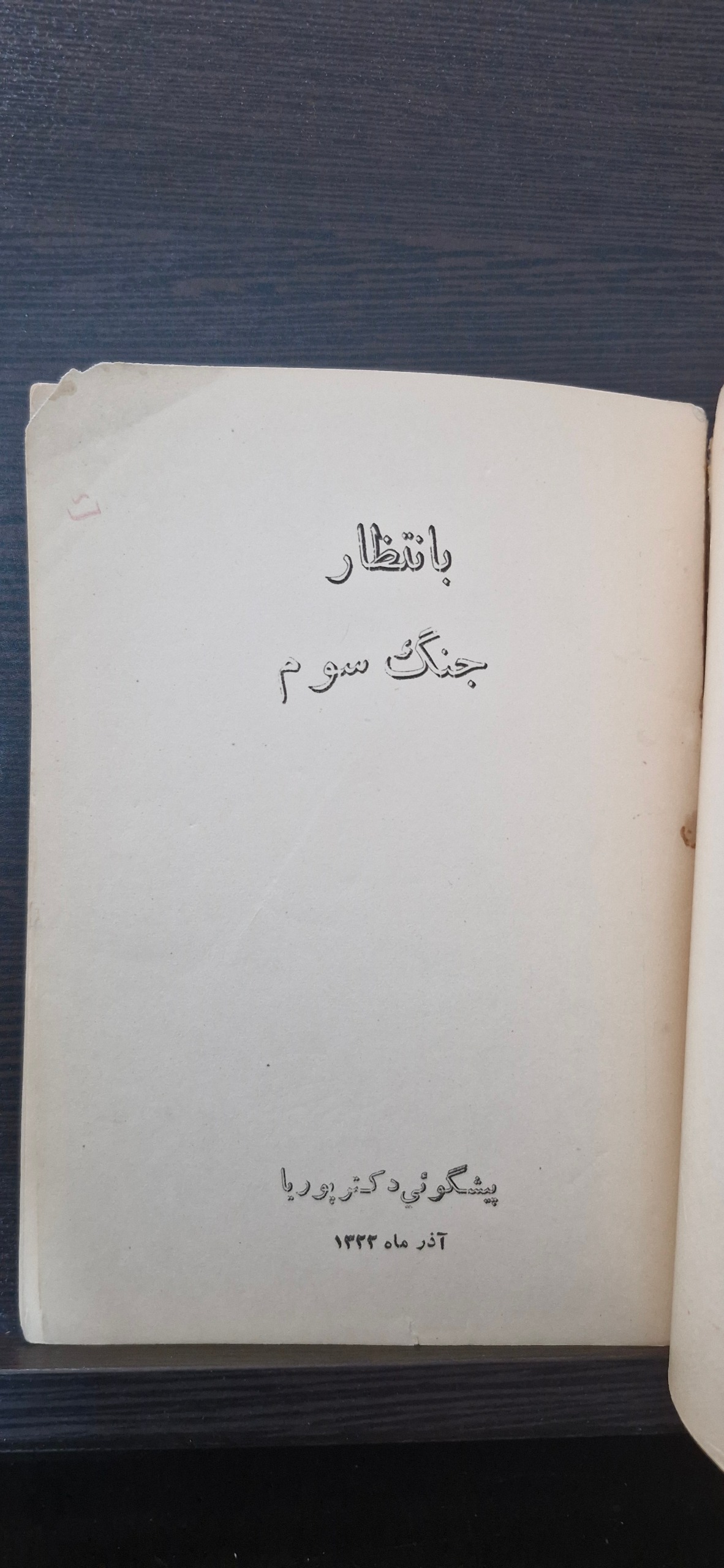 کتاب قدیمی به انتظار جنگ سوم پیشگویی دکتر پوریا چاپ 1322 هست 72 صفحه خریدار محترم لطفا با دقت به توضیحات هر کالا دقت بفرمایید کالاها کیفیت شان مطابق با تصویر هست و انواع کتاب، مجله، روزنامه، اسناد و عکسهای قدیمی از دوره قاجار تا پهلوی و اوایل انقلاب موجود