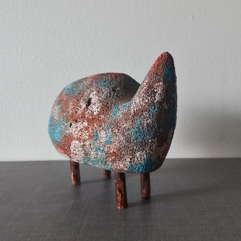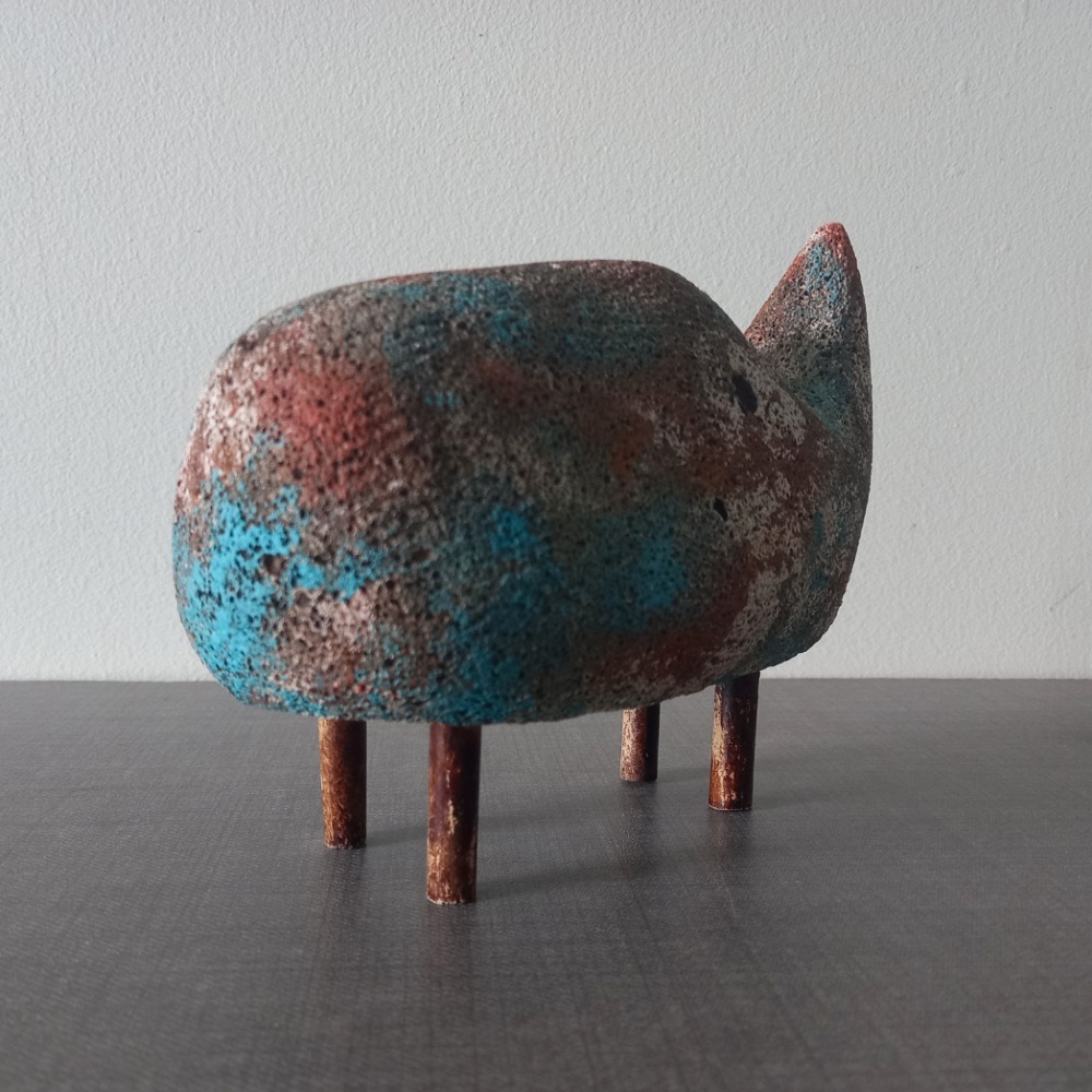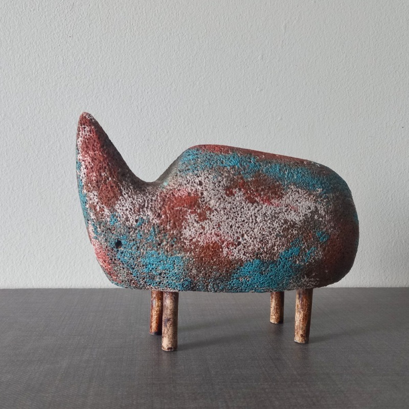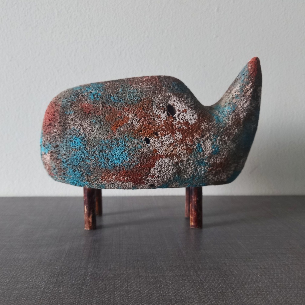 این مجسمه از محصولات گالری هنری پیرایه است.یک برداشت ساده سازی شده و مینیمال از پیکره کرگدن با رنگ آمیزی پتینه و کهنه نماست.