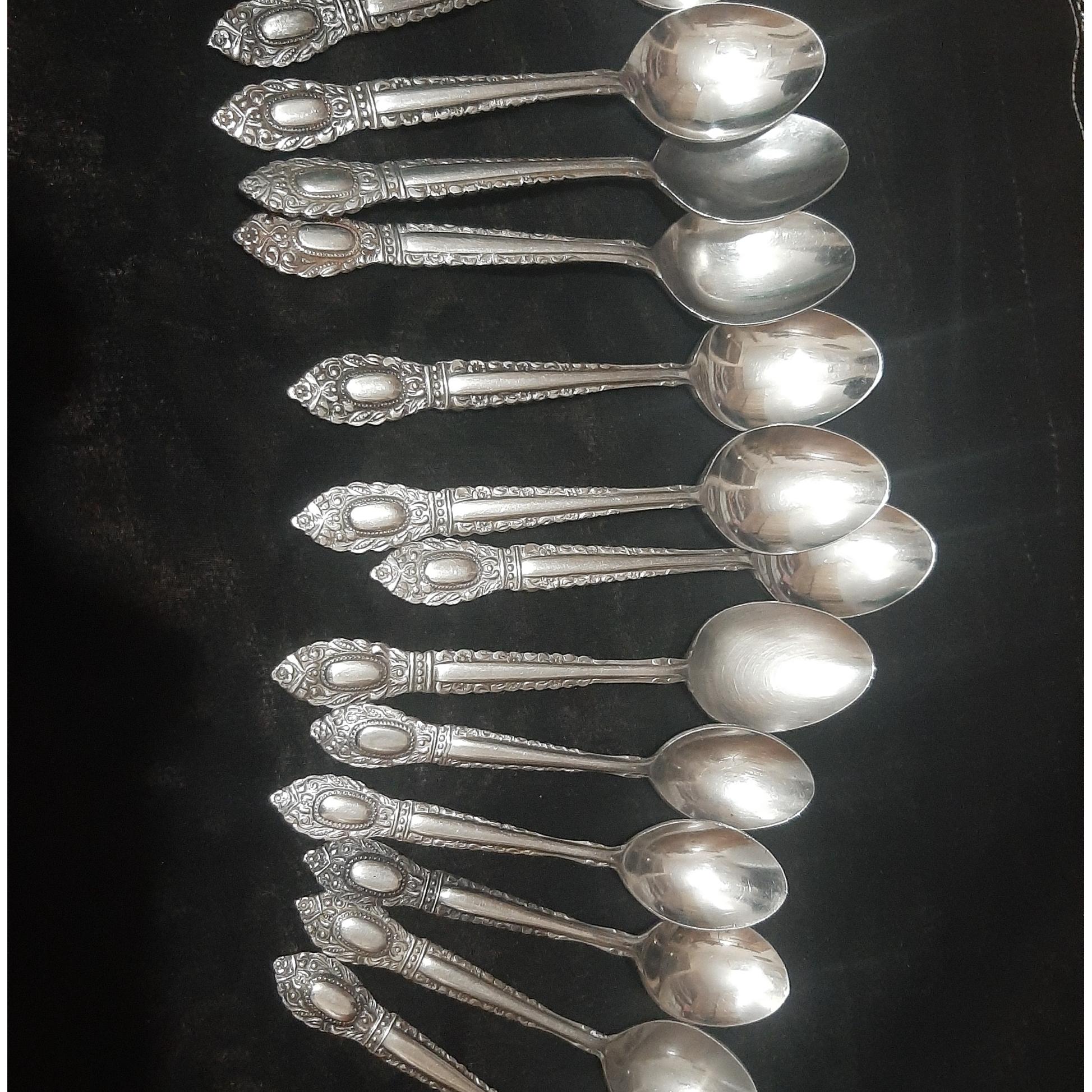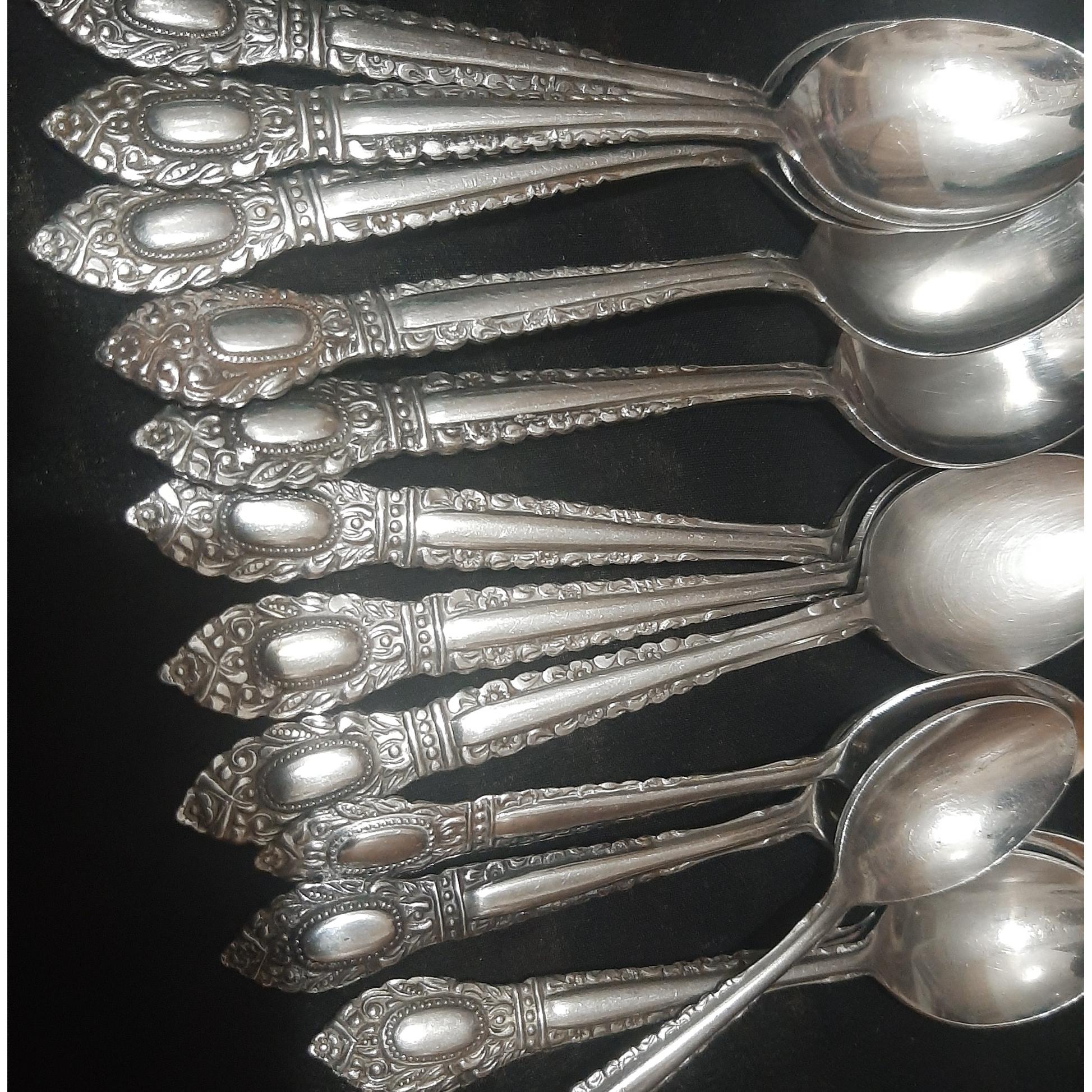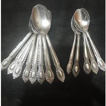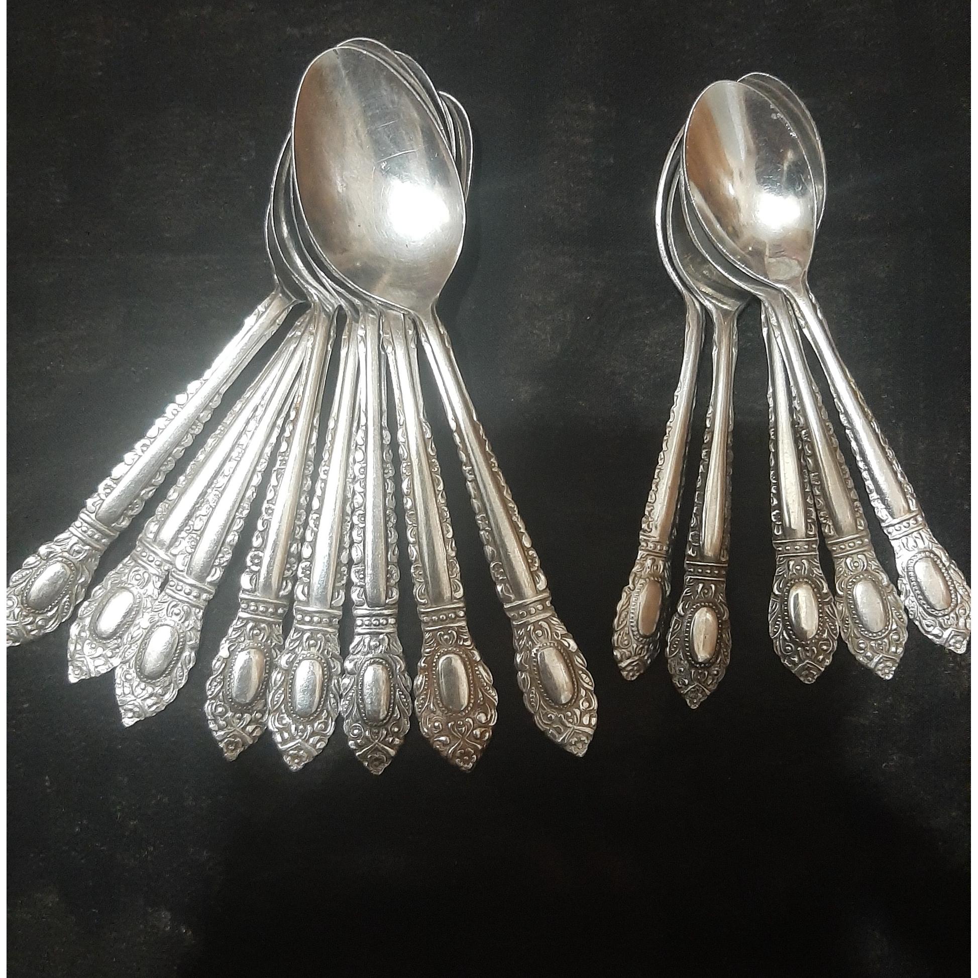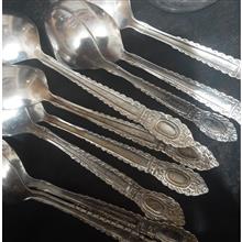 9 قاشق مربا خوری و 5 قاشق چای خوری دست دوم مارکهای مختلف عمر 60 ساله همگی کمی خط و خش دارند جهت باغ دو تا شون کمی زدگی و نقطه سیاه دارند حساب نشده