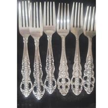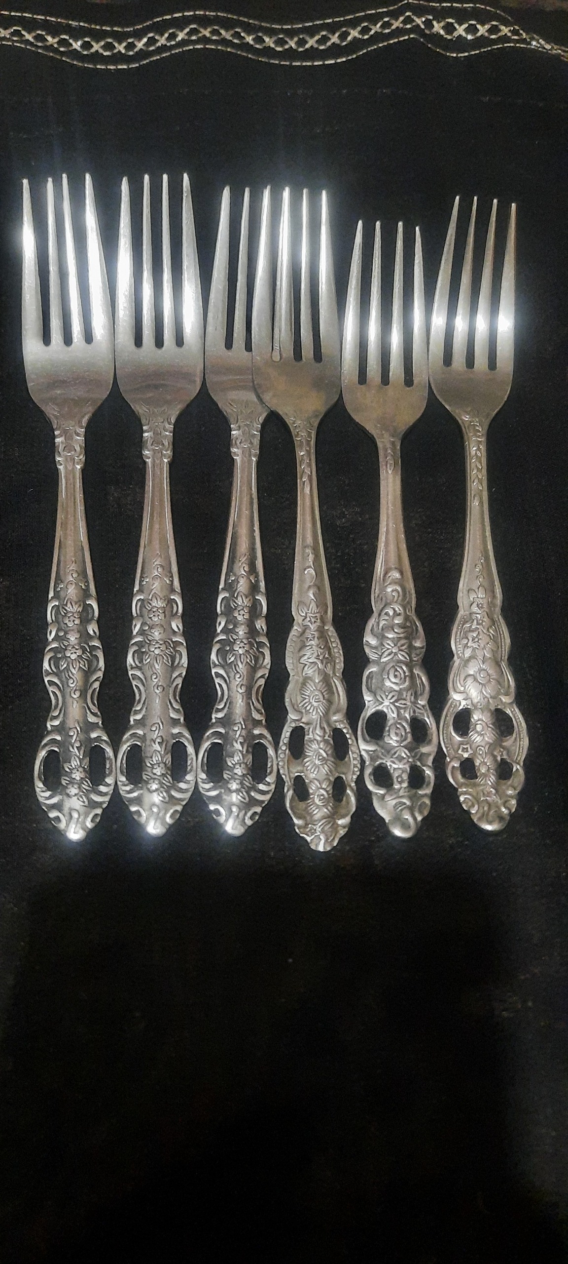 شش عدد چنگال میوه خوری گل و مارک متفاوت عمر 60 سال دست دوم اندازه و گل هر یک متفاوت است تقریبا سه به سه ولی باز یکی بلند تر است به عکسها توجه کنید 60