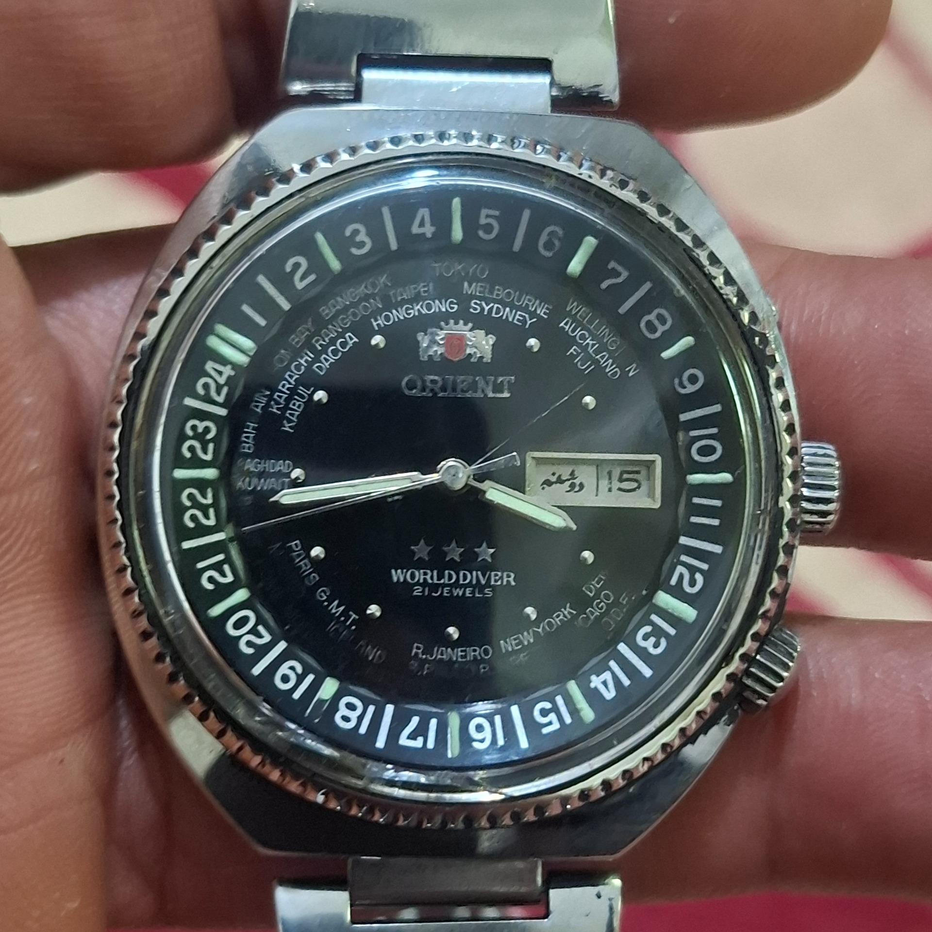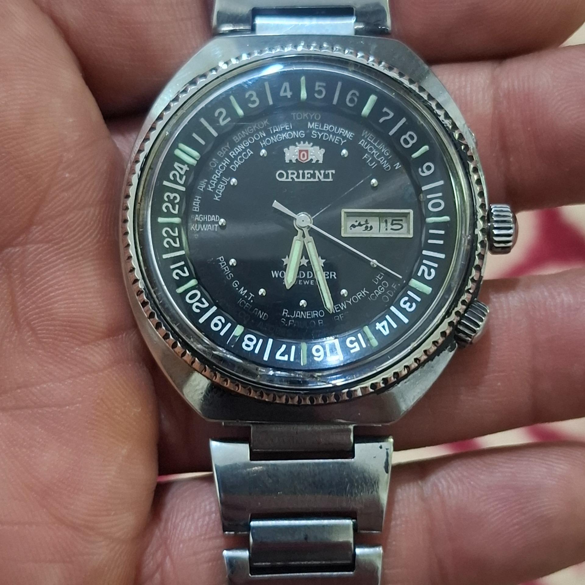 ساعت اورینت جهان نما اصلی ،زه داخلی چرخون،تمام فابریک 21جواهر، تقویم فارسی انگلیسی، تقویم پمپی،