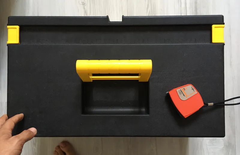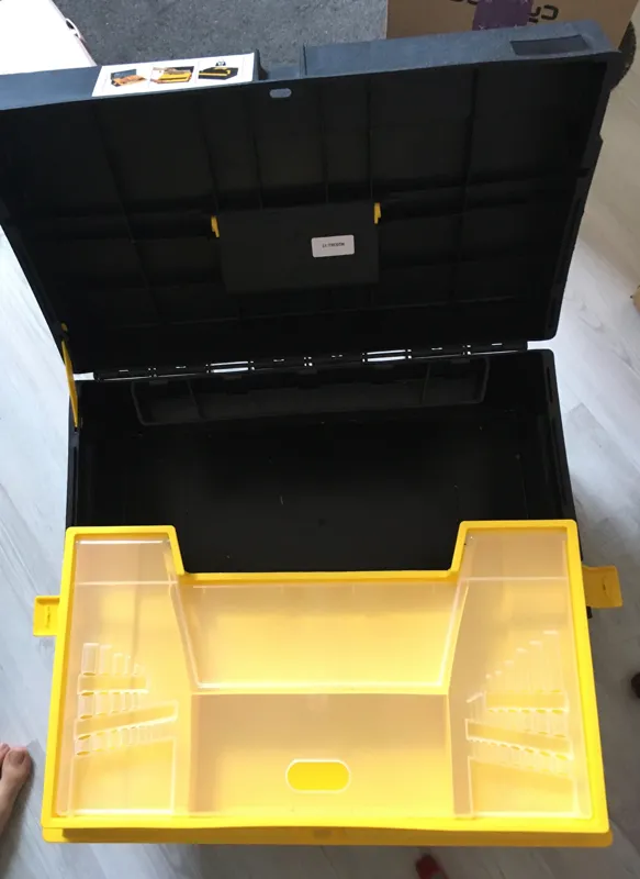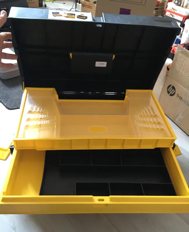 جهبه دارای قسمتهای مختلف برای ابزار، یک قسمت کشویی و یکی دیگه ریلی.