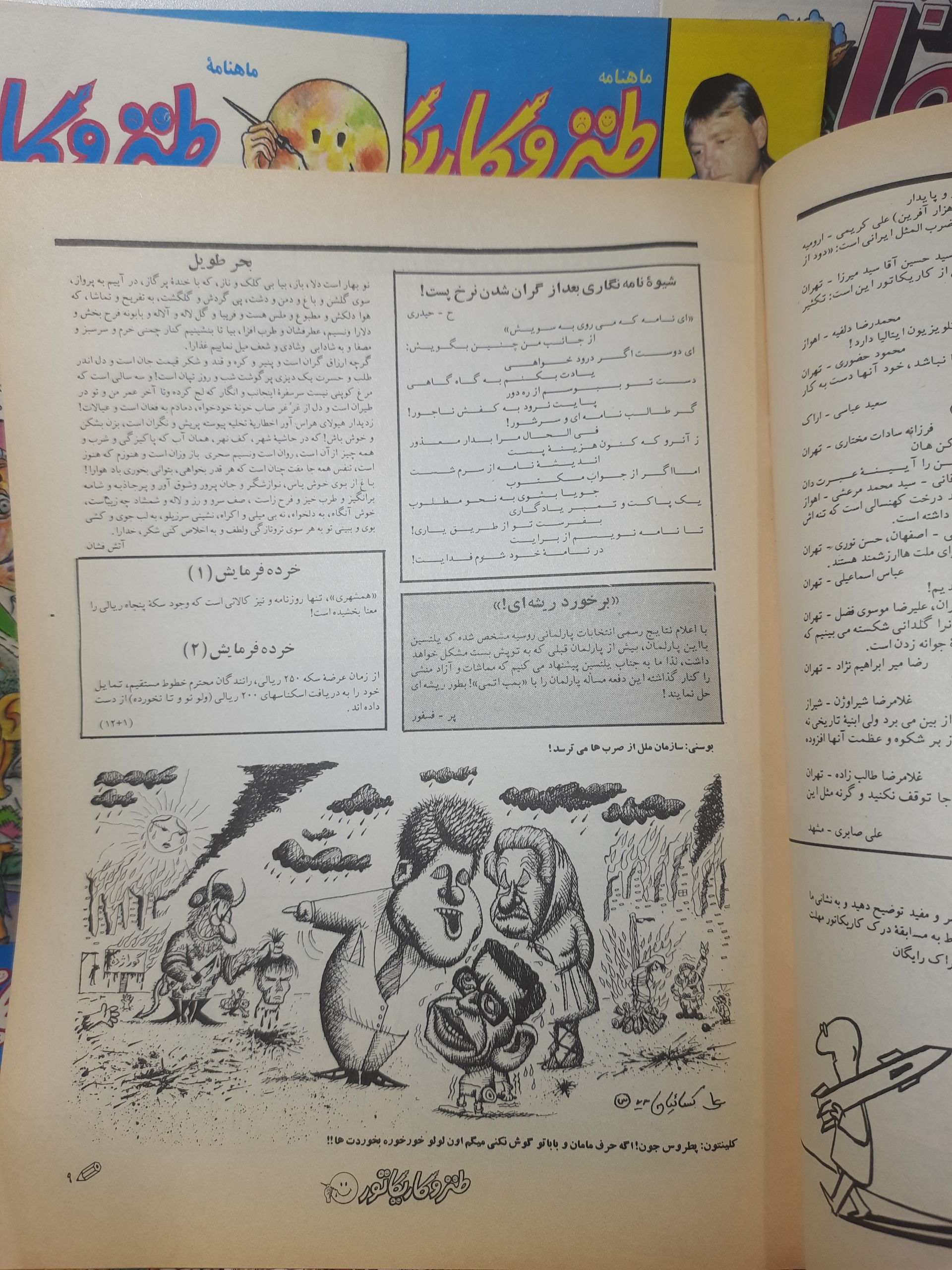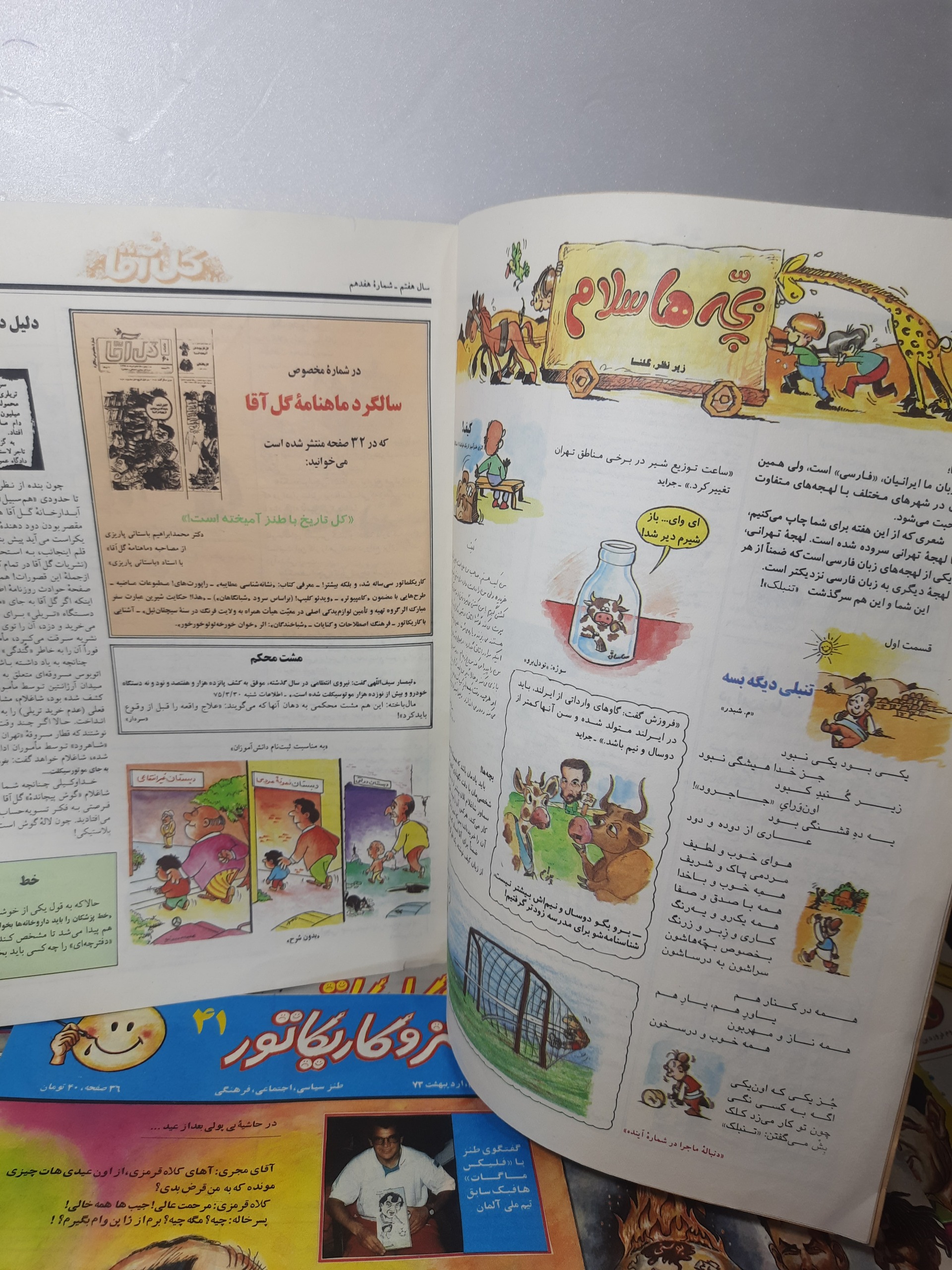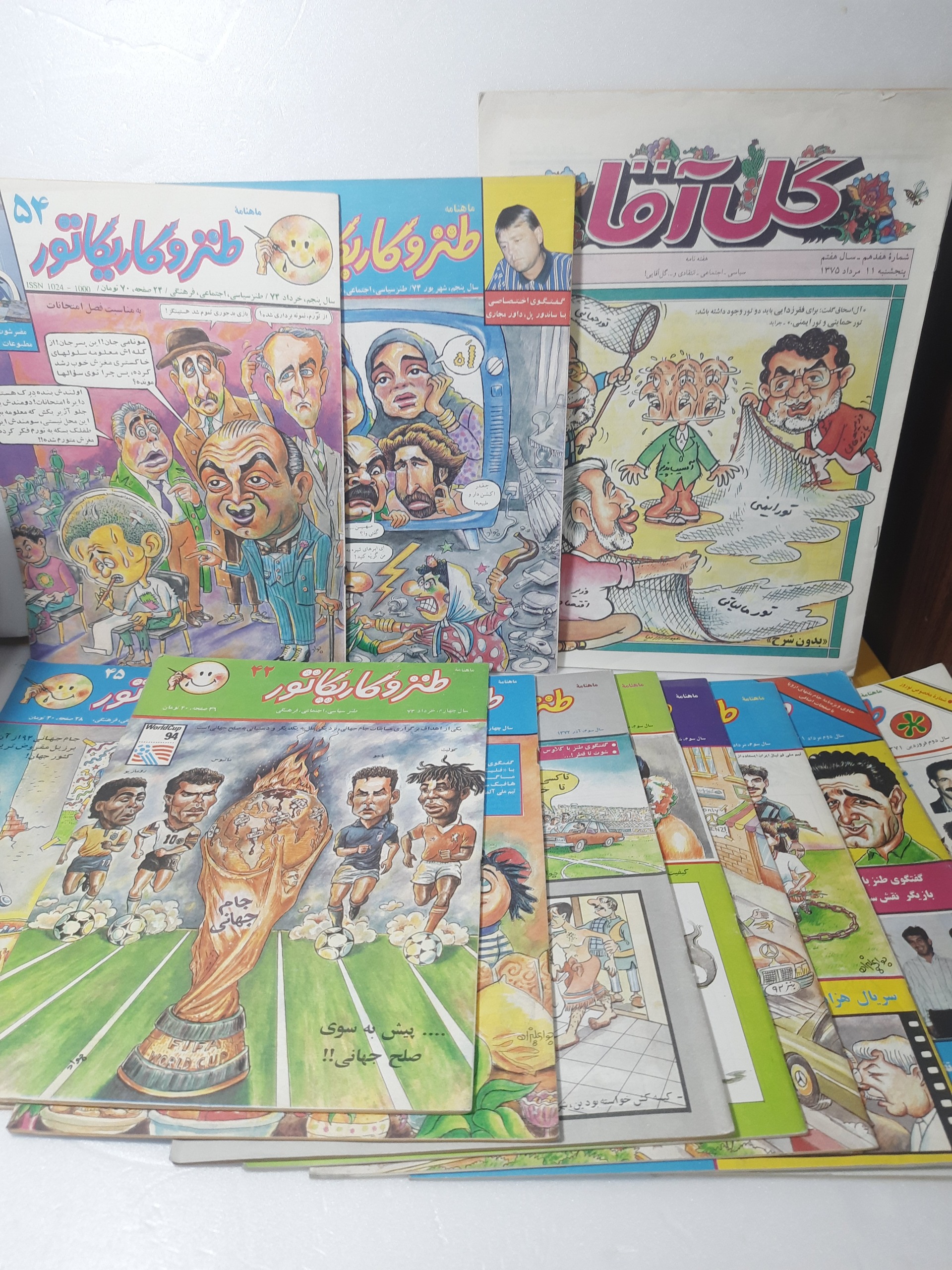 کد 2077 مجله ماهنامه طنز و کاریکاتور 11 عدد سایز آچار بسیار بسیار کمیاب و یک عدد مجله گل آقا سایز سلطانی مربوط به سالهای 71تا75  دارای صفحات رنگی با کیفیت خیلی خوب سالم باهم بفروش میرسد