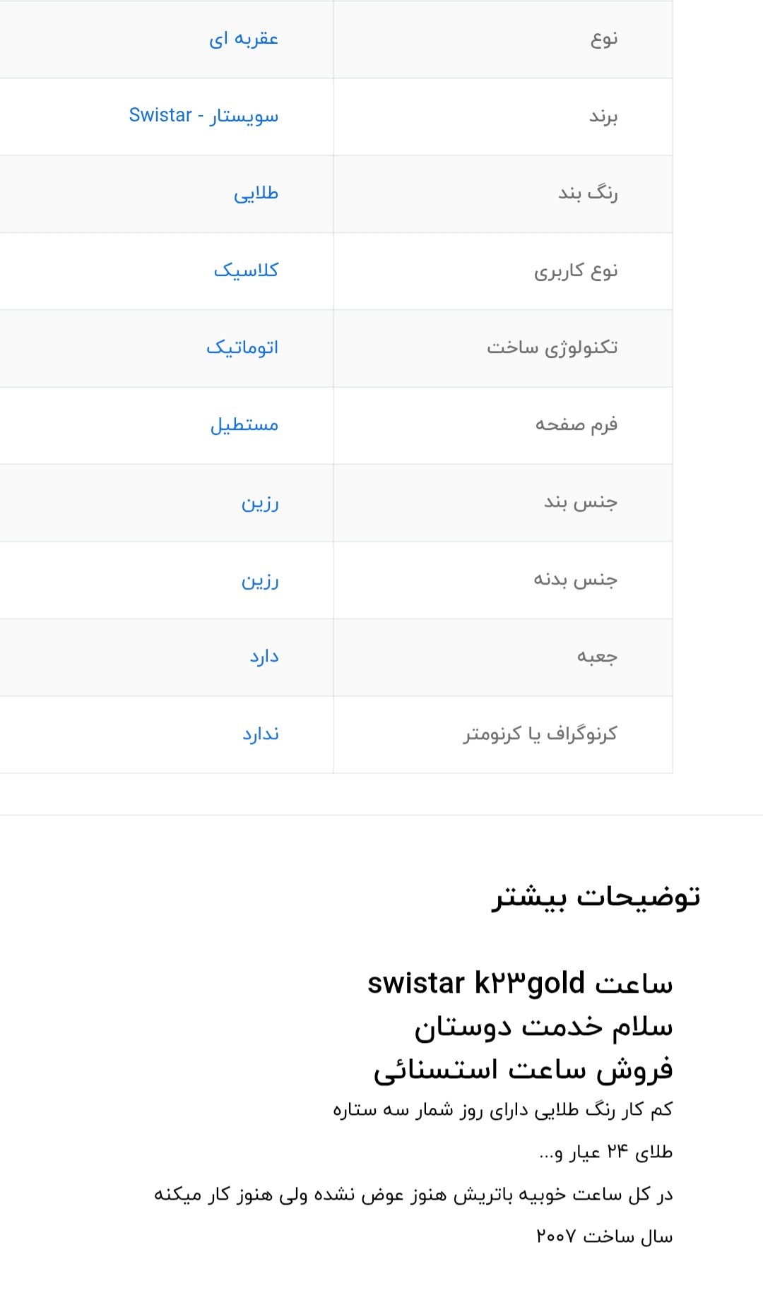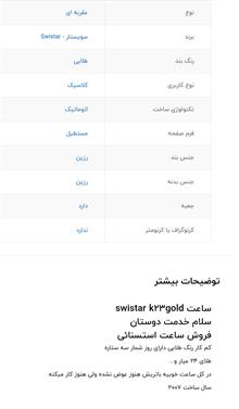 سلام یک ساعت مچی مردانه قدیمی سویسی اصل 23k روکش طلا وعفربه واعداد هم طلا هستن فقط یکی از عکس که گذاشتم از جلو گرفتم خودش نیست همینه فقط یکم ساعت خودم پیش عدد تاریخ ماه یکم ازطلا پوسیده شده خیلی ریز دیگه هیچ مشکلی ندارد کسی خریدار عکسش میفرستم خوب ببینه من خیلی نیاز به پول میخوام بفروشم این هم که ترجمه کردم این کلمات پشتی رو ترجمه کردم باقیمت مناسب میدمش لطفن علکی تماس نگیرید مشتری هستس تماس بگیر باتشکرازسایت ایسام