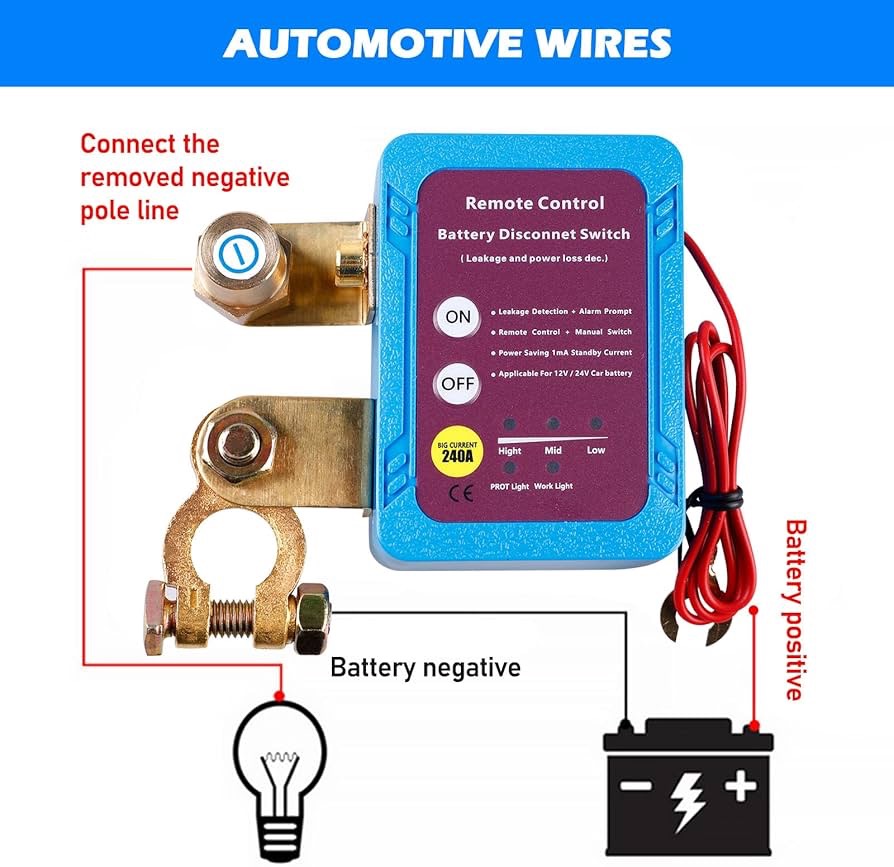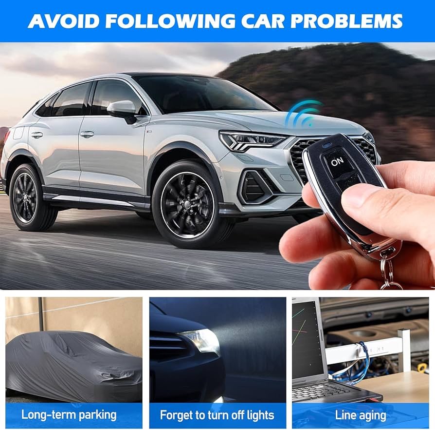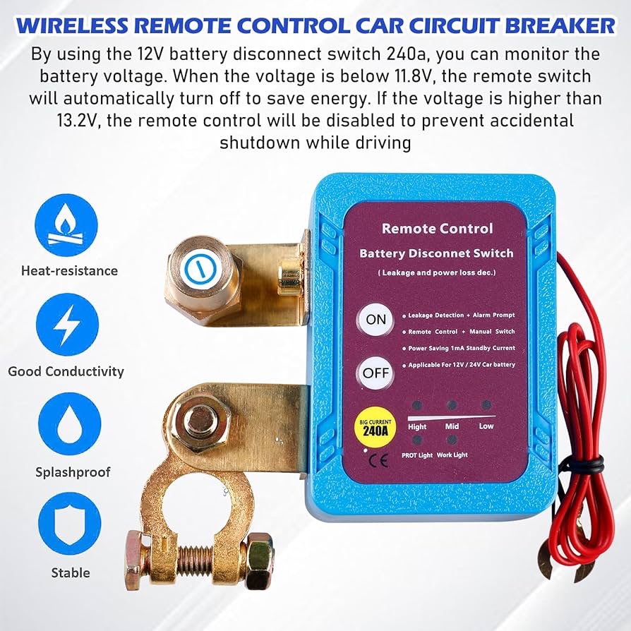 کلید قطع باتری 12 ولت: هنگامی که ولتاژ باتری کمتر از 11.8 ولت باشد، کلید قطع باتری از راه دور به طور خودکار پس از 120 ثانیه برق را قطع میکند تا در مصرف برق صرفهجویی شود. هنگامی که ولتاژ بالاتر از 13.5 ولت باشد (مانند هنگام رانندگی)، کنترل از راه دور قادر به کنترل کلید نخواهد بود و فقط با کلید دستی قابل کنترل است.