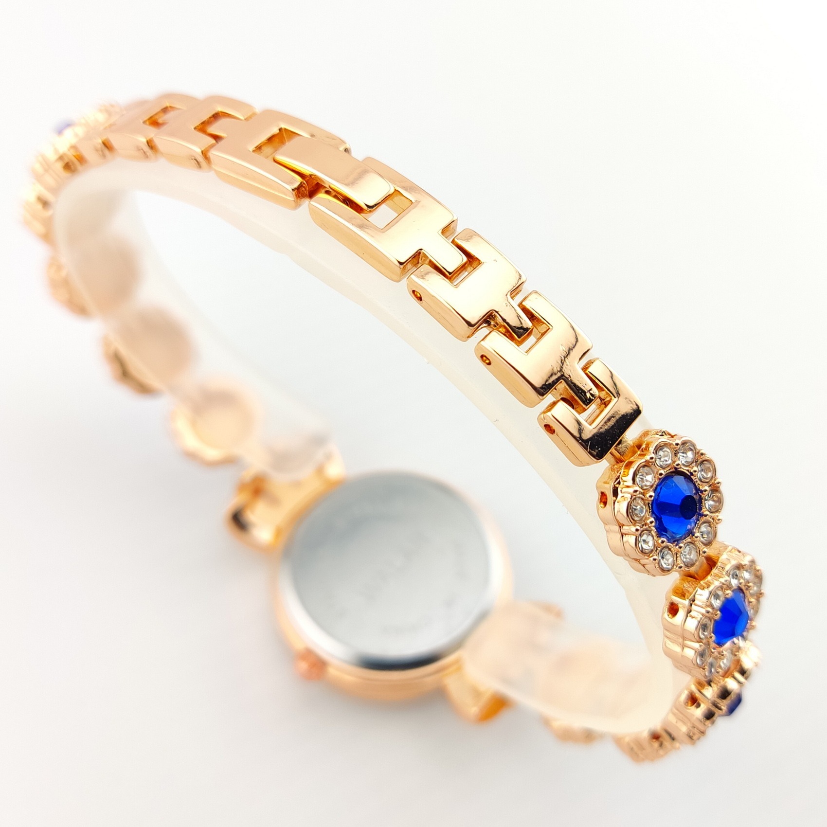 بدنه و بند استیل فلزی براق به رنگ رزگلد با نگین های بزرگ و کوچک و قفل قفل دستبندی