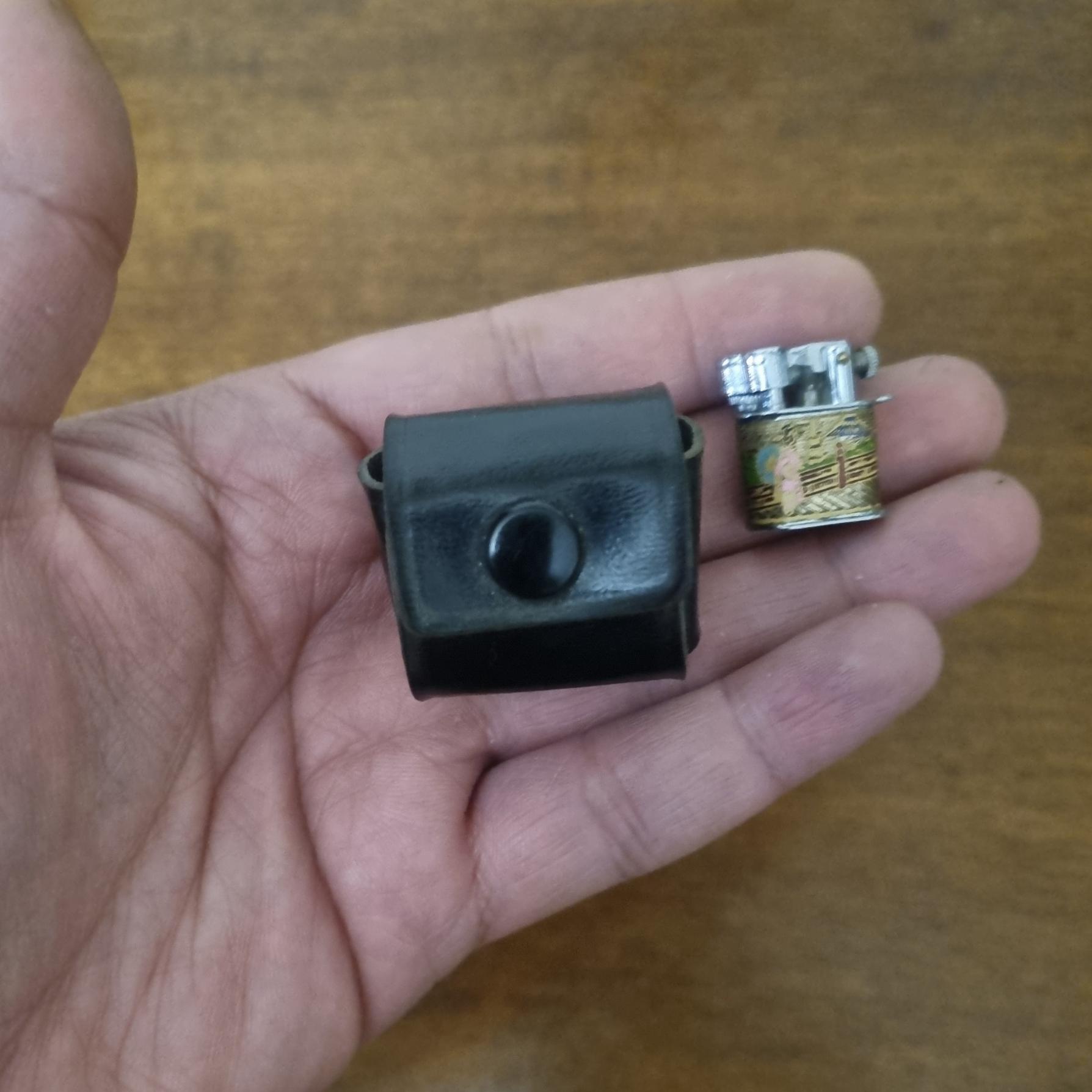 کوچیکترین فندک بنزینی بدنه مینا فقط یکبار جهت تست بنزین شده کیف چرم گردنی و کمری قدمت حدودا 50 سال کف حک شده ژاپن ( برند بصورت تصادفی انتخاب شده)
