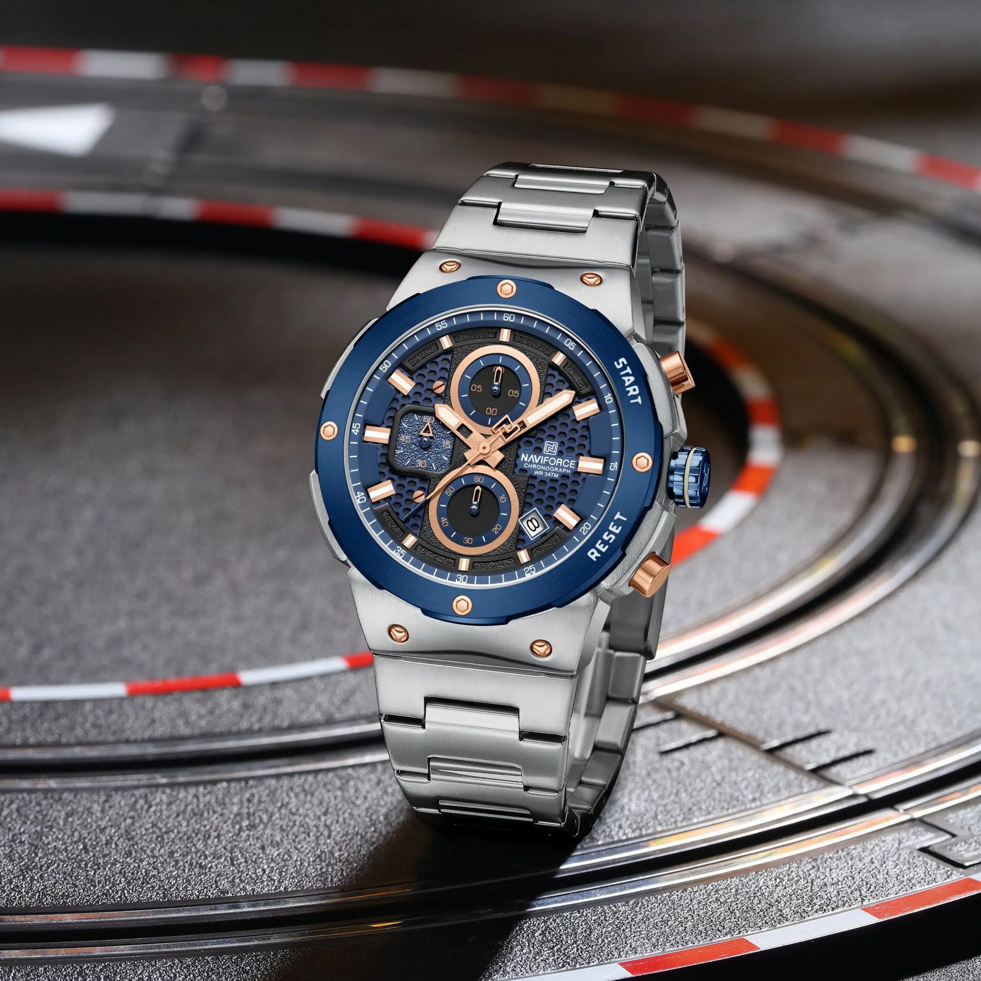 مزایده داغ ساعت مردانه NAVIFORCE بسیار خوشدست و لوکس اورجینال دارای سه موتور قدرتمند  کرنوگراف ژاپنی با تقویم روزشمار که تمام عقربه های روی صفحه فعال هستند