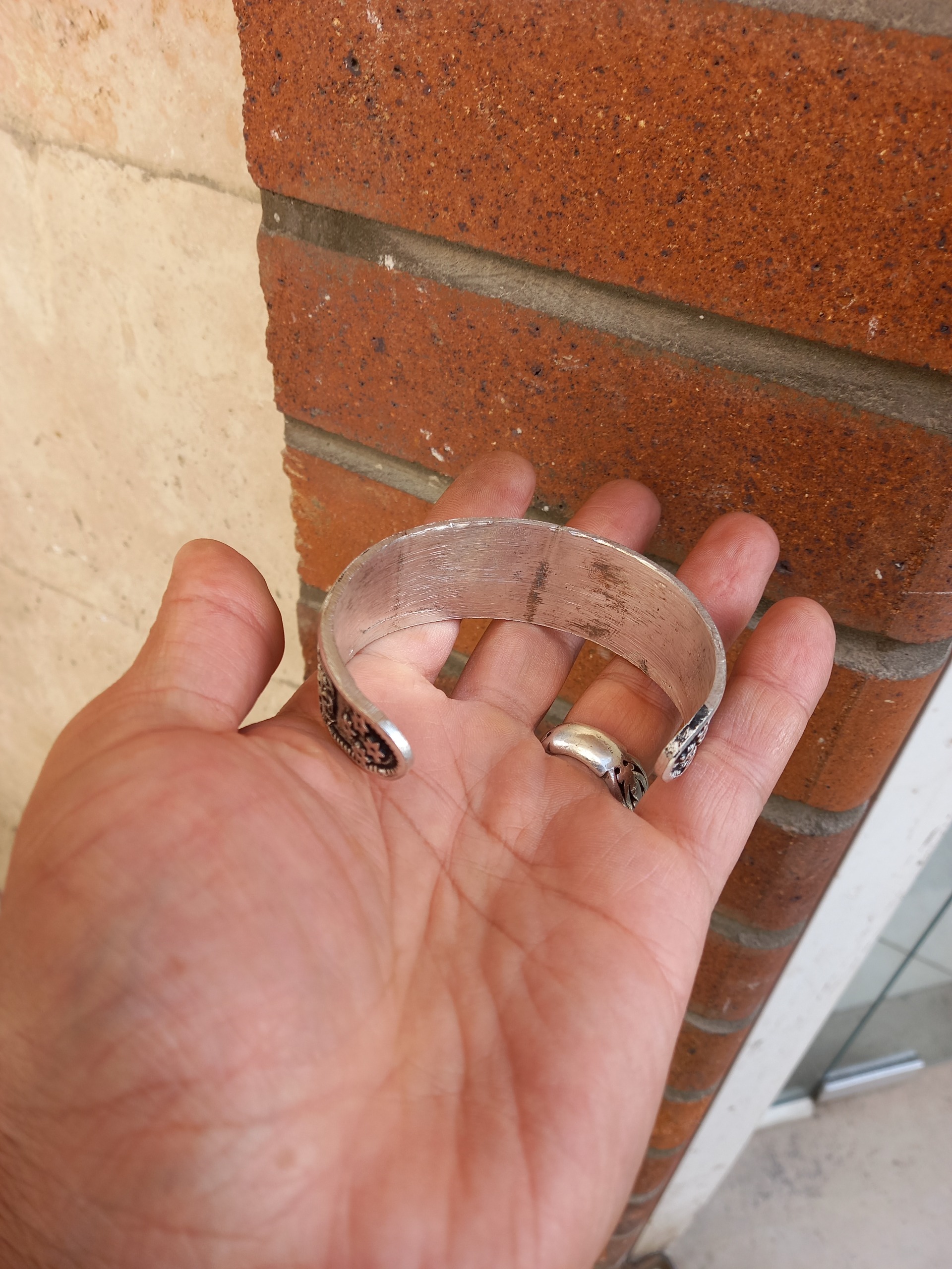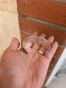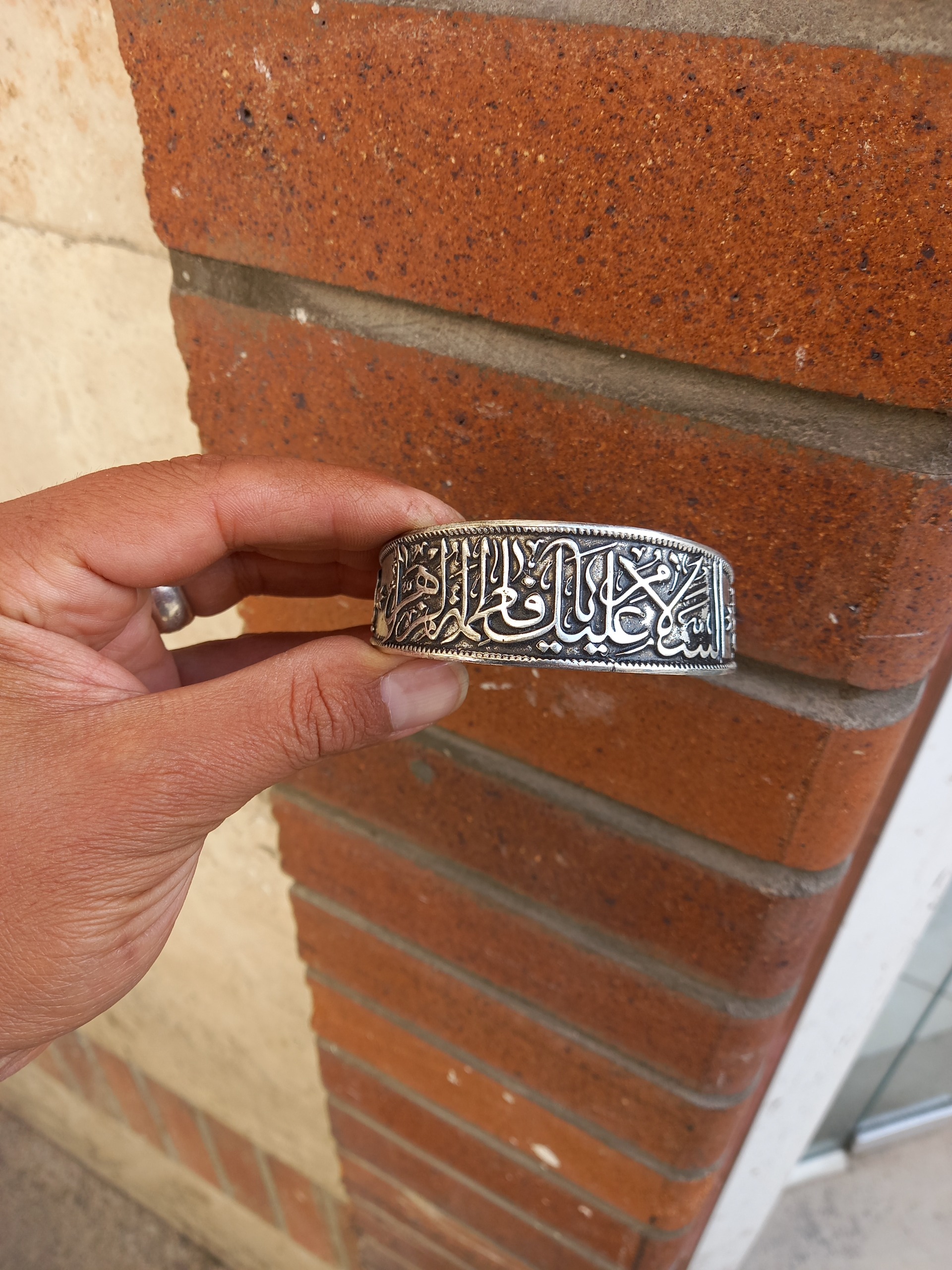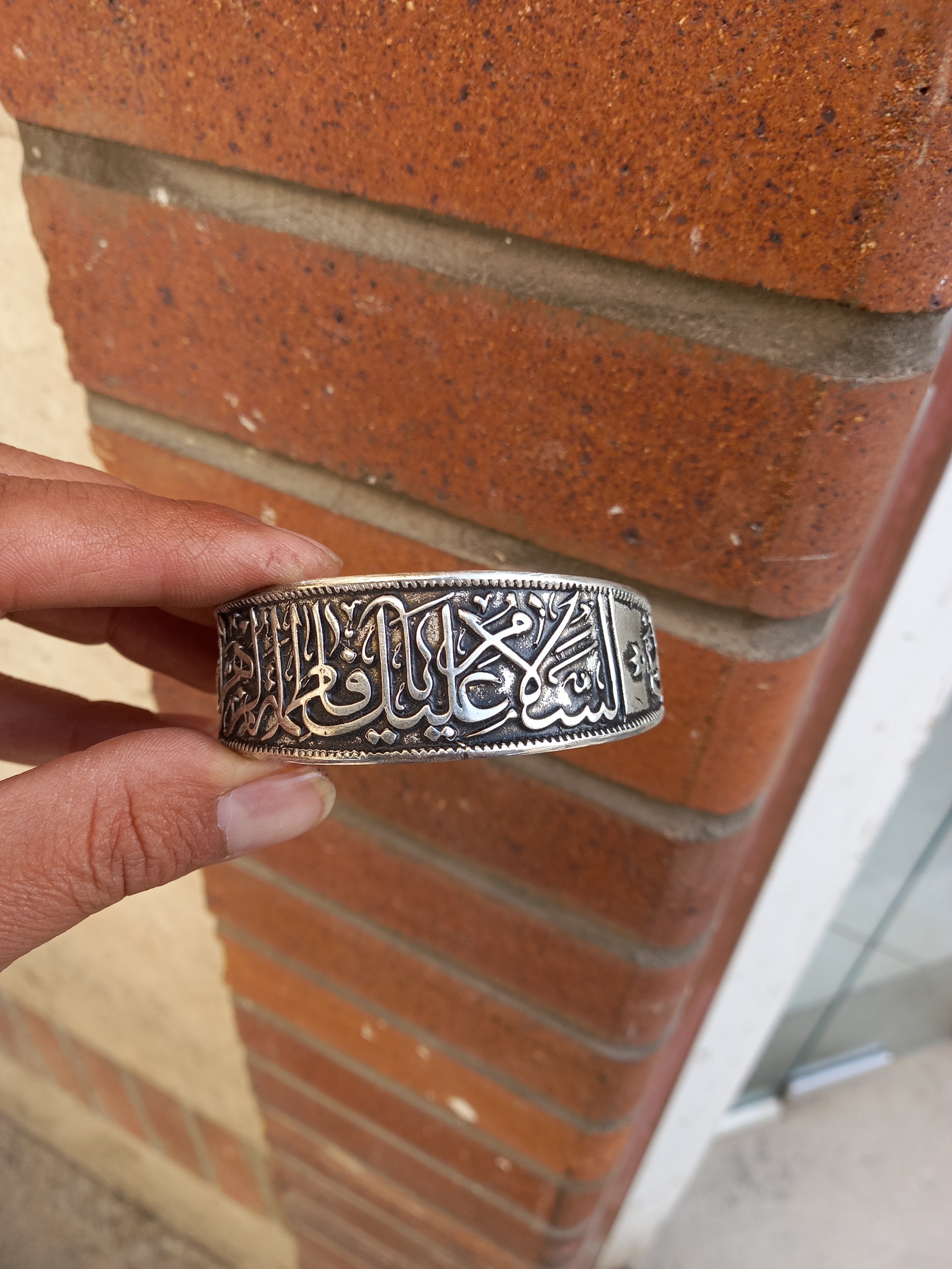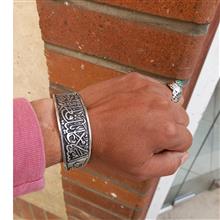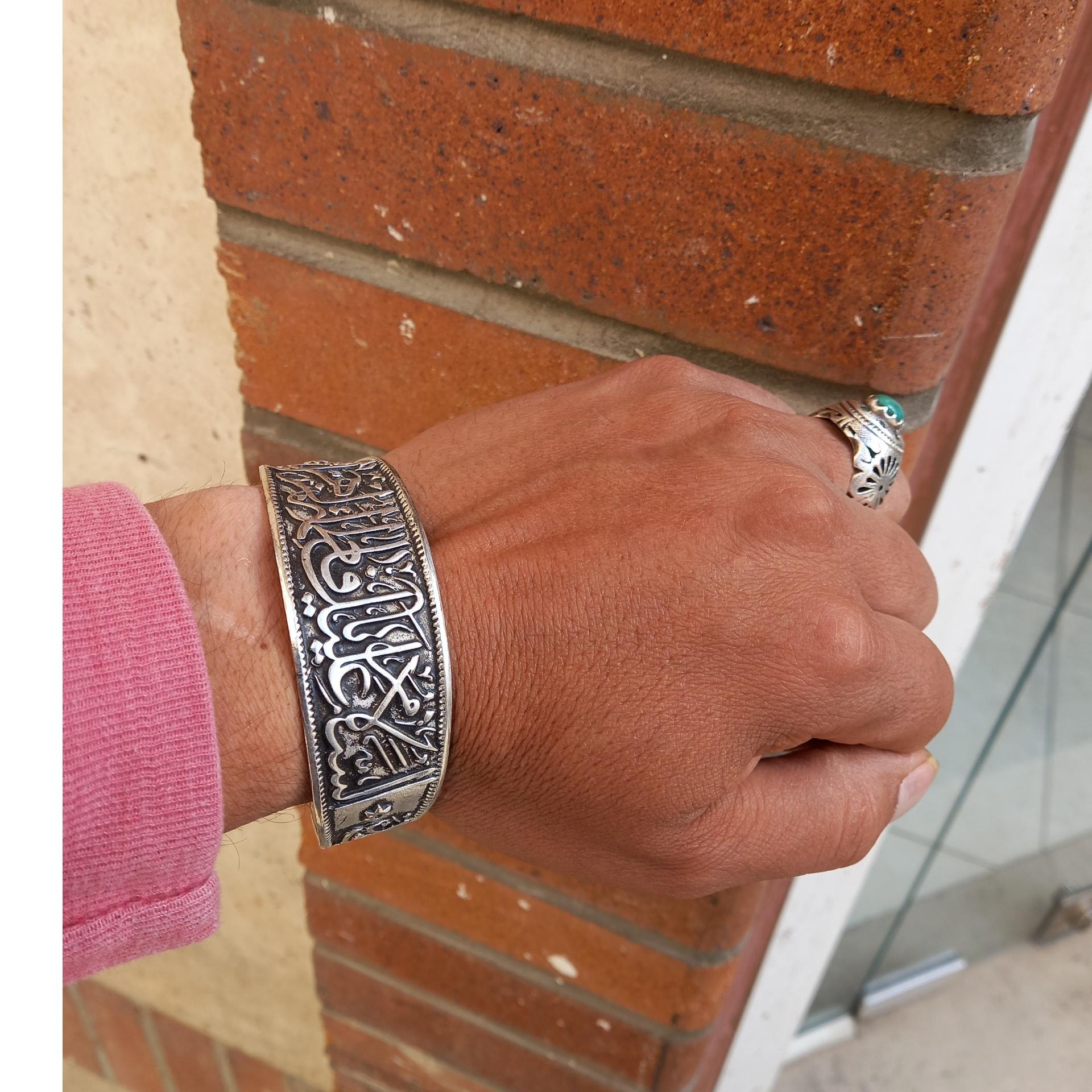 دستبند برنجی ابکار نقره ای نقش برجسته السلام علیک یا فاطمه زهرا باطراحی بینظیر وخاص فیری سایز قابل باز وجمع شدن رنگ ثابت هدیه وکادوی ماندگار