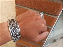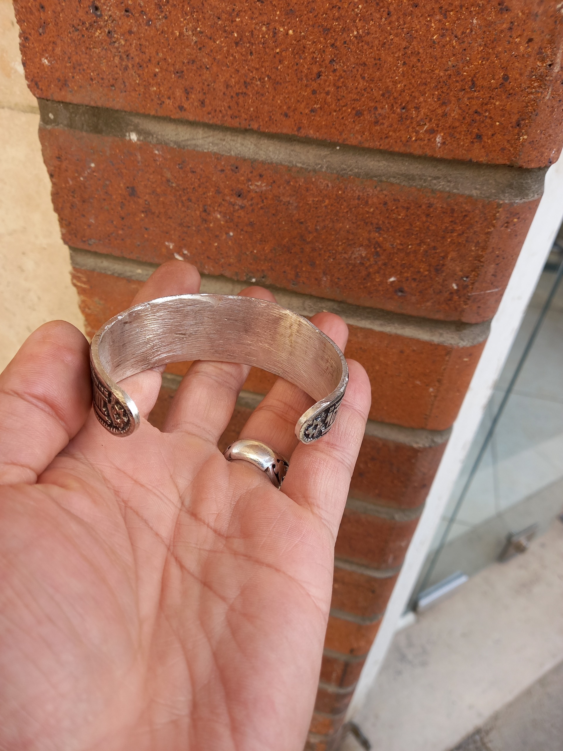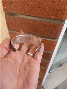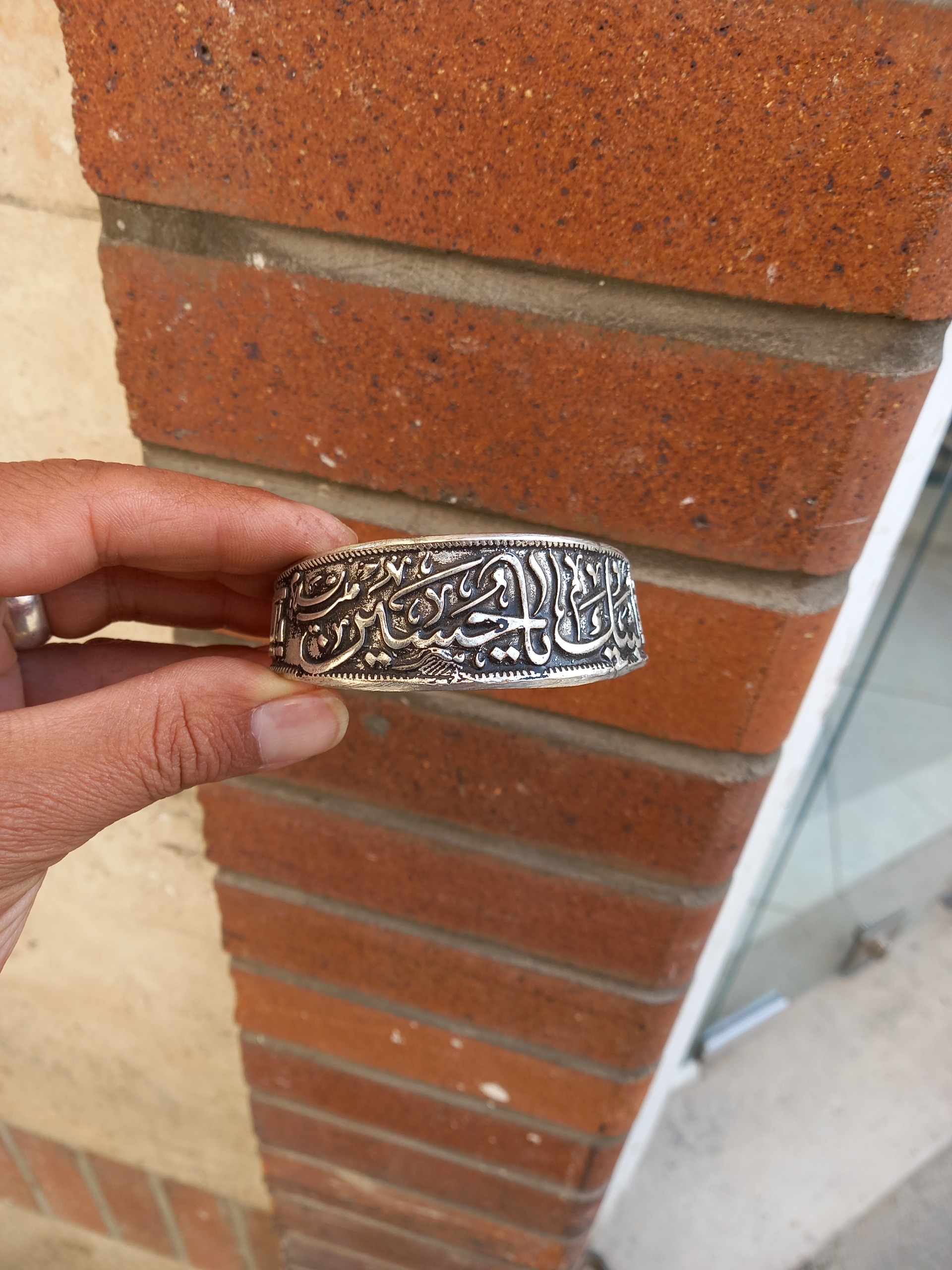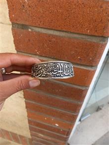 دستبند تمام برنجی ابکاری نقره ای باطراحی بینظیر نقش برجسته لبیک یا حسین فیری سایز قابل بازوجمع شدن سیاه قلمکاری شده هدیه وکادوی ماندگار