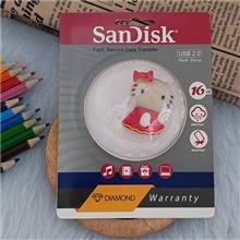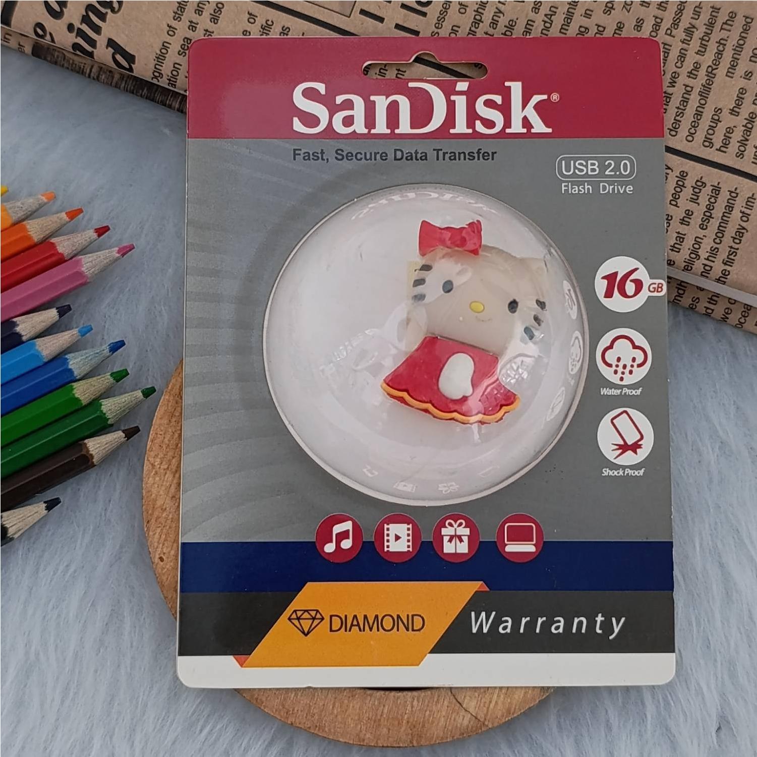 این تصویر یک فلش مموری SanDisk با ظرفیت 16 گیگابایت را نشان میدهد که با طرح Hello Kitty تزئین شده است. این فلش مموری از نوع USB 2.0 است و قابلیت ضد آب و ضد ضربه بودن آن ذکر شده است. همچنین نمادهایی برای پشتیبانی از موسیقی، فیلم، هدیه و کامپیوتر در بستهبندی آن دیده میشود.