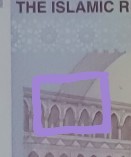 ارور این اسکناس در فقط این امضاها و این دوره و تاریخ انجام شده..کمان دور خورشید تابالای دو پنجره کمانی شکل و دوربین از بالا انجام شده طبق تصویر..من یک خط از بالای حجره رو دارم ولی این جالب ه..