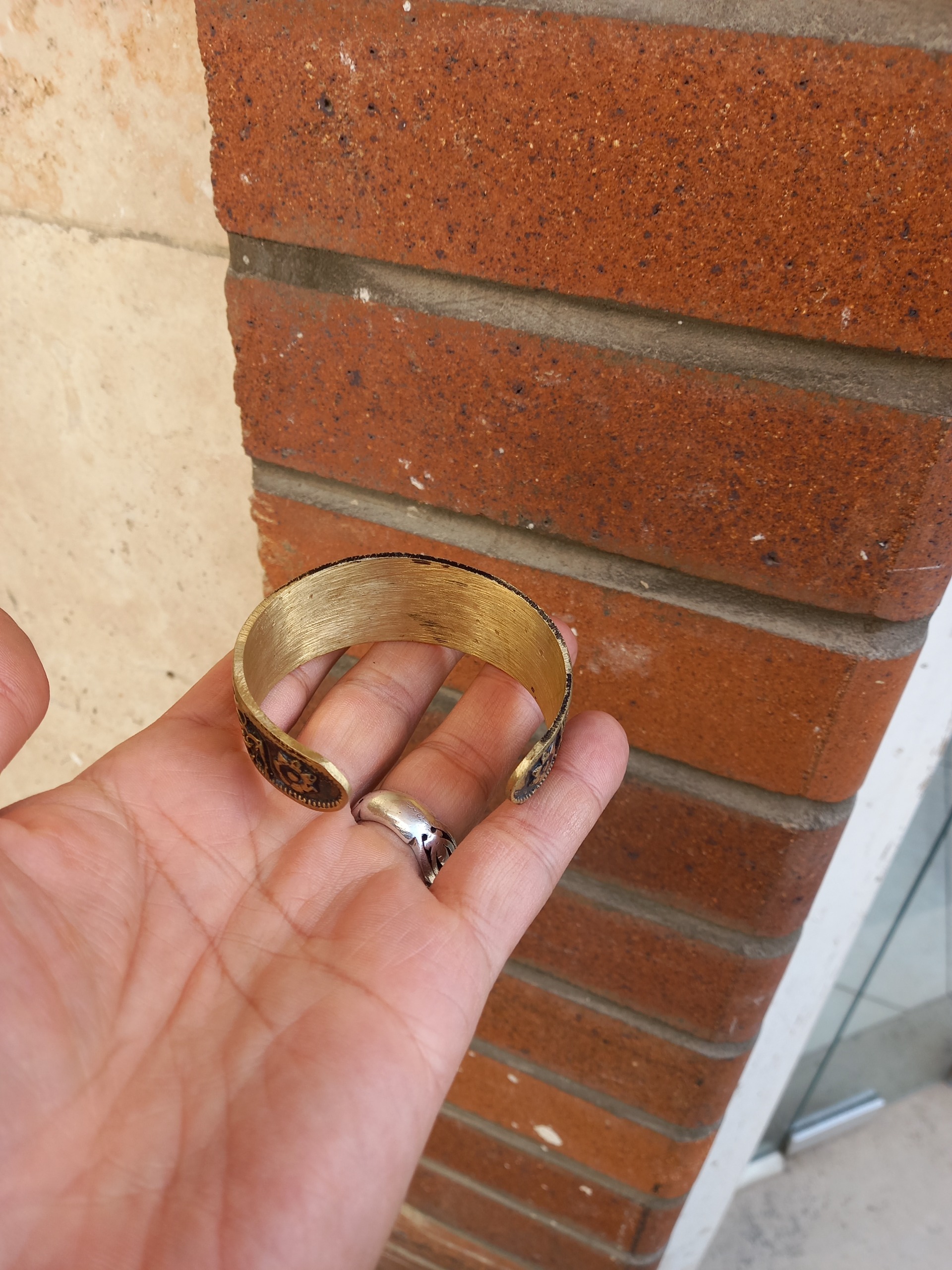 دستبند تمام برنجی سیاه قلمکاری شده نقش برجسته السلام علیک یا علی بن موسی الرضا پهن فیری سایز رنگ ثابت قابل بازوجمع شدن هدیه وکادوی ماندگار