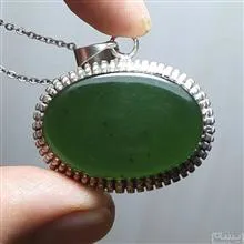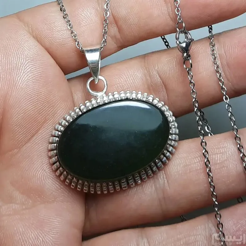 گردنبند نقره دستساز یشم خوشرنگ و آبدار و ذغالدار درشت اصل معدنی با قاب نقره ضخیم و جوندار و زیبا هنر دست استاد جباری عیار 925 و زنجیر استیل 45 سانتیمتری