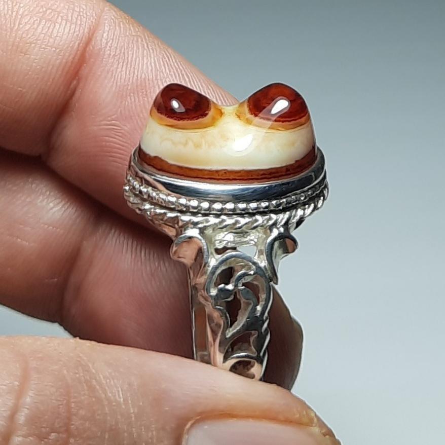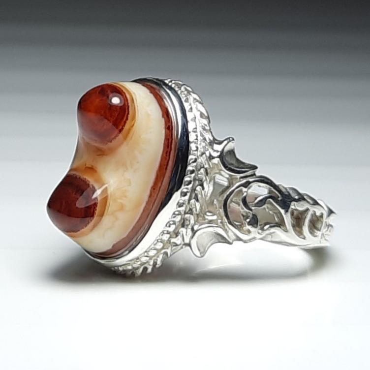 انگشتر نقره سفارشی ساز عقیق سه پوست با تراش دوکوهانه اصل معدنی با طوقهای خوشرنگ و منظم و موازی و رکاب عیار استاندارد 925