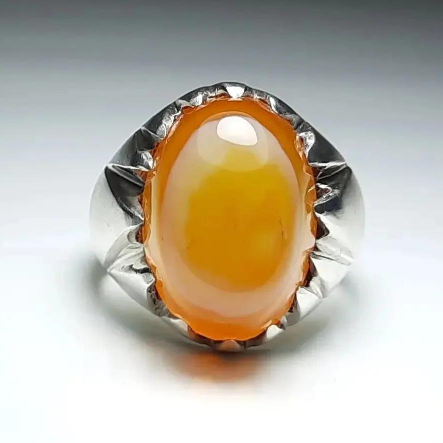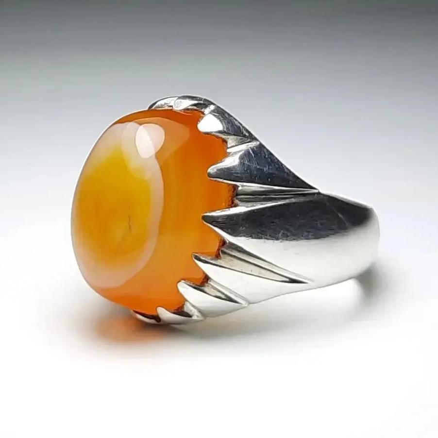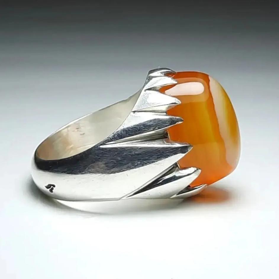 انگشتر نقره دستساز عقیق پرتقالی دو پوست ( کلاه دار ) نیمرویی منظم و میزان ، سراسر طوق ، بسیار خوشرنگ و آبدار و لامپی با رکاب زیبا هنر دست استاد قنبرزاده با مهر ایشان