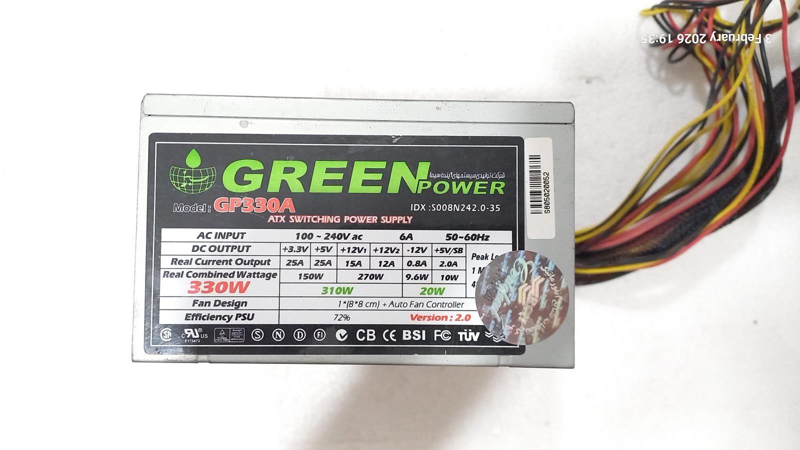 پاور گرین مدل GP330A پاوری با خروجی 330 وات واقعی و فن کوچک و 24 پین میباشد.این پاور توان خروجی 330 وات واقعی و پیوسته با دو خط 12 ولت و خروجی 12 و 15 آمپر را دارد.