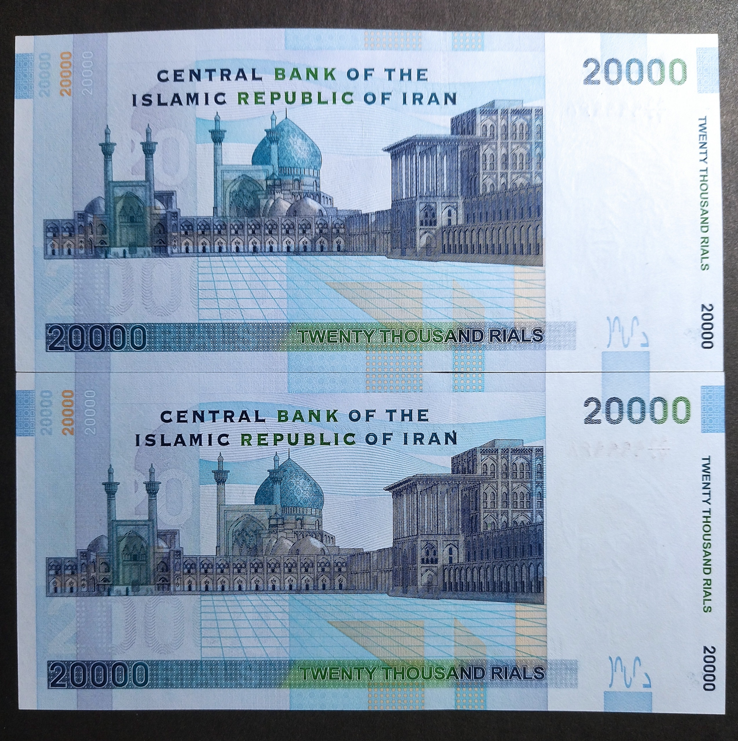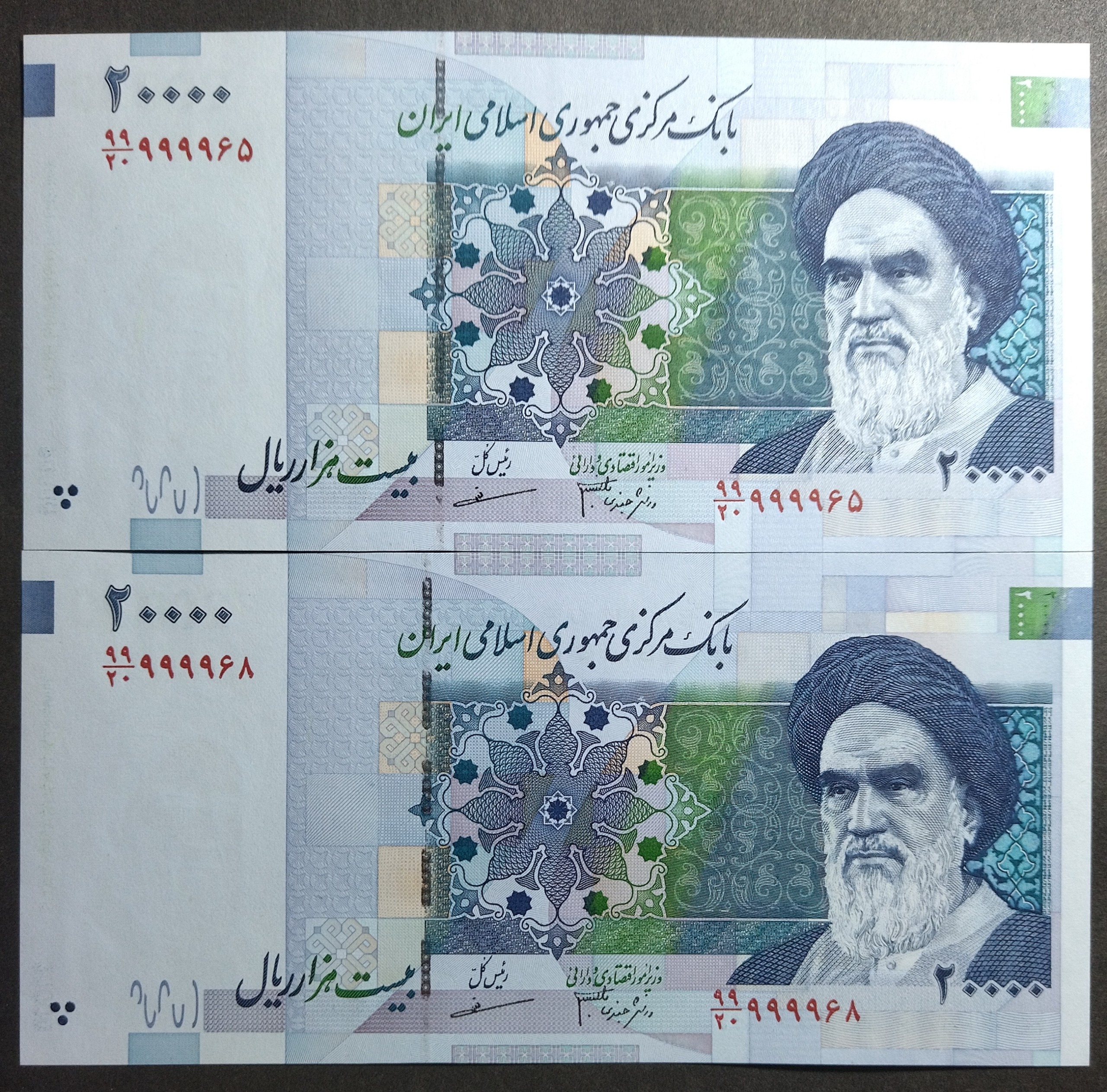مطابق تصویر جفت سوپربانکی 2000 تومانی پشت مسجد شماره خاص تکرار 6 بار رقم 9 (صورت 99) امضای دانش مظاهری با اینکه جفت فاصله دار هست اما به دلیل تکرار 6 بار رقم 9 ارزش کلکسیونی بالایی دارد.