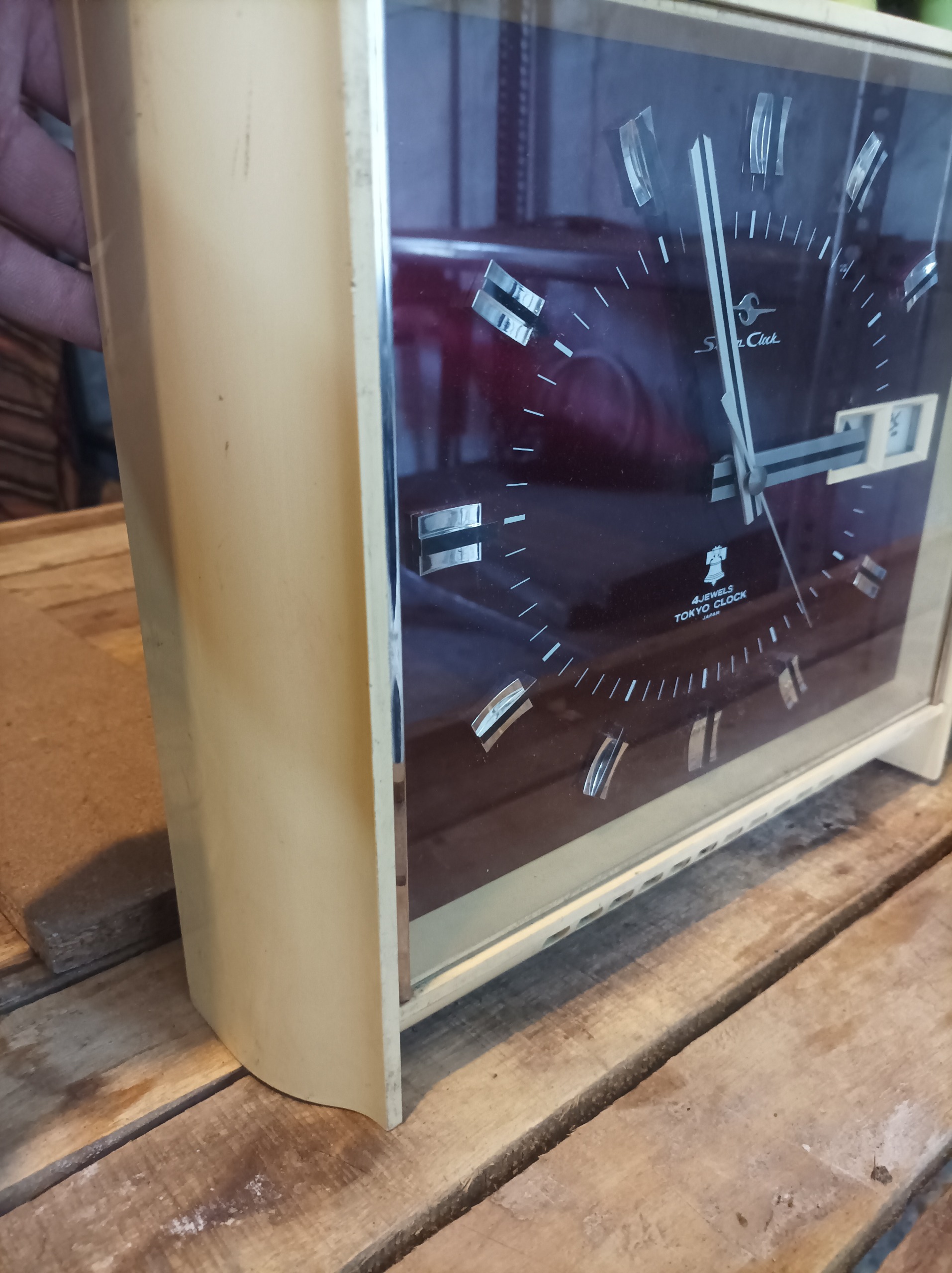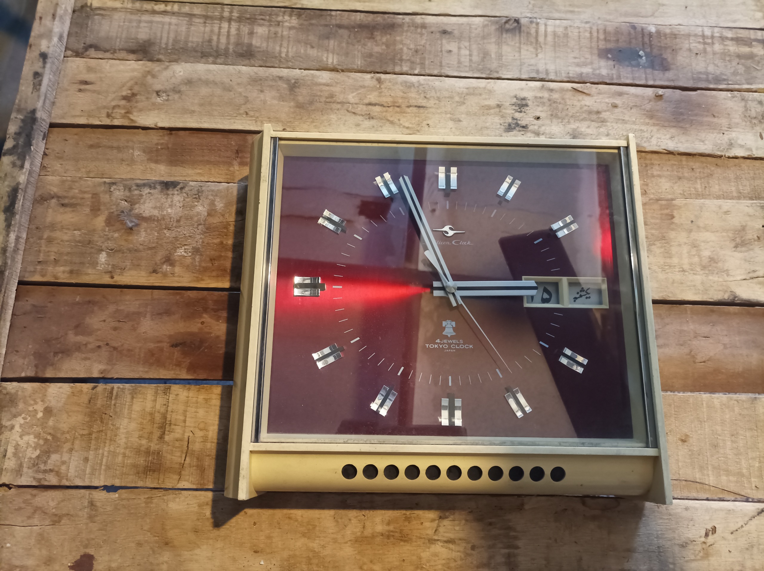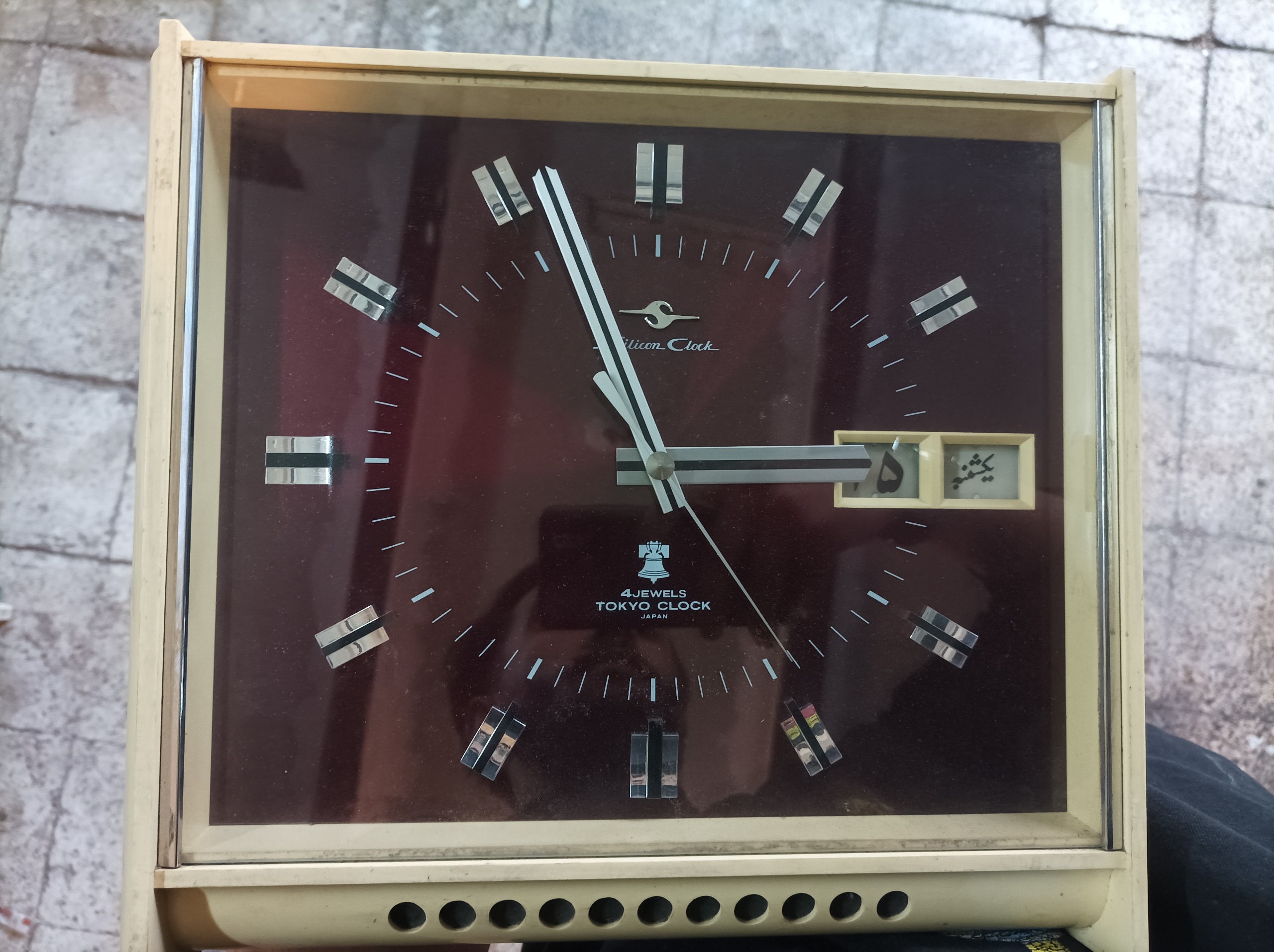 یکی از نایاب ترین مدل های ساعت دیواری زنگی تقویم دار که کاملا سیستم مکانیکی میباشد حتی زنگش و تقویمش اصل ژاپن با قدمت بیش از 50 سال کاملا قطعات اصلی و سالمه بدون کوچک ترین تعویض و تعمیر قطعه ای پشت چوب دور ساعت پلاستیک که به خاطر قدمی بودن و قدمتش قاب سفیدش کمی تغییر رنگ داده از نظر کارکرد هم تنها با یه تمیز کاری و سرویس جزئی میزون کار میکنه