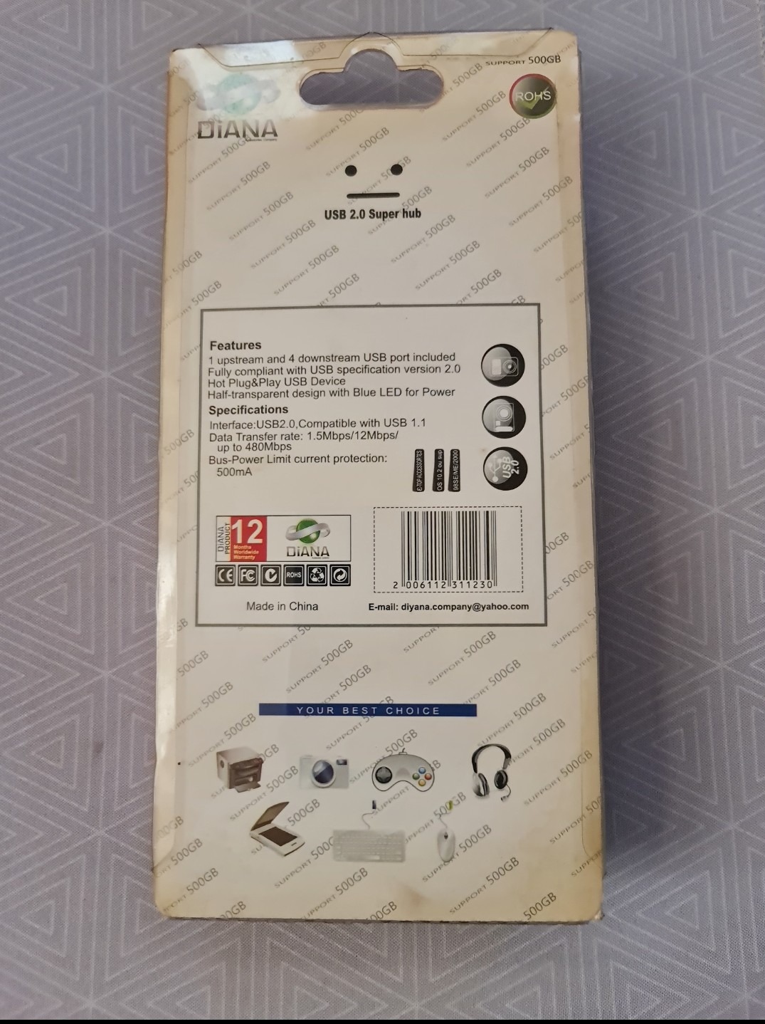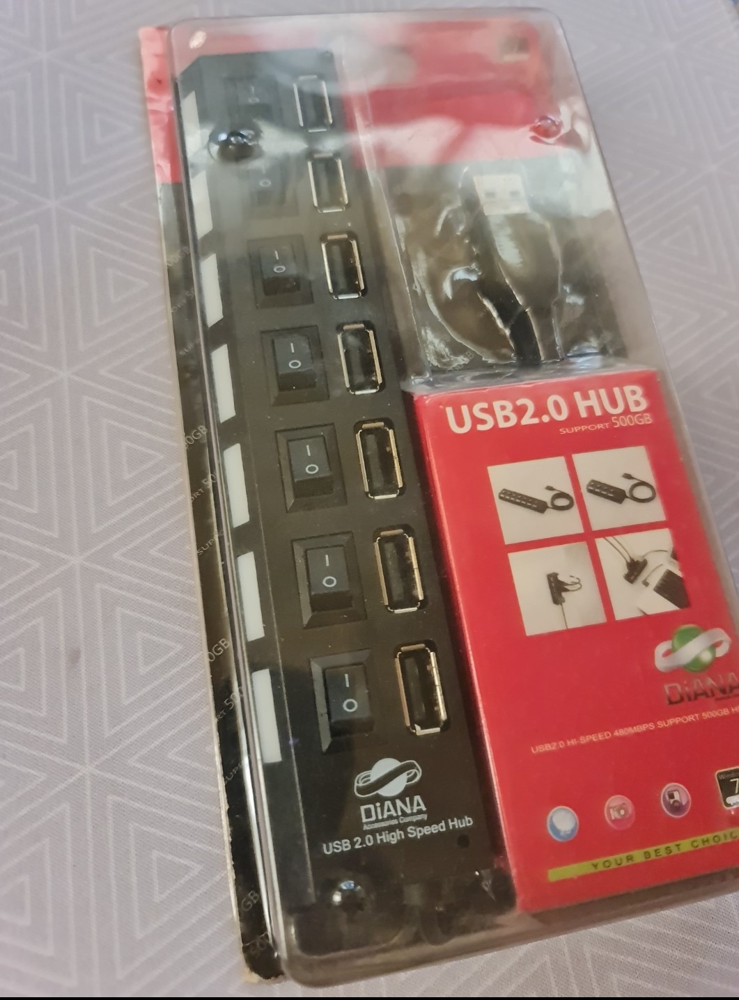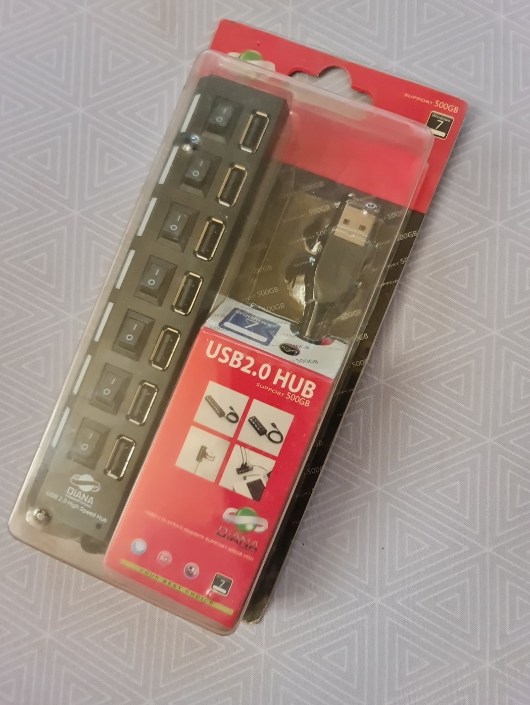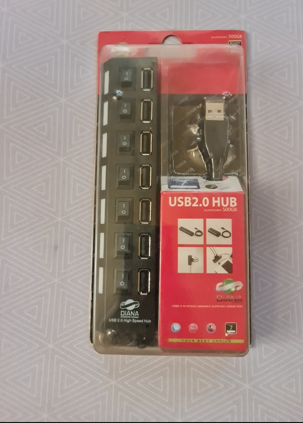 هاب 7 پورت USB2 ، هر پورت USB بطور مختص به خود دارای یک کلید روشن و خاموش به همراه یک چراغ می باشد ، رنگ مشکی ،مدل دایانا ، ضمنا دارای یک ورودی برای اتصال آداپتور و ساپورت دستگاهایی چون هارد اکسترنال می باشد