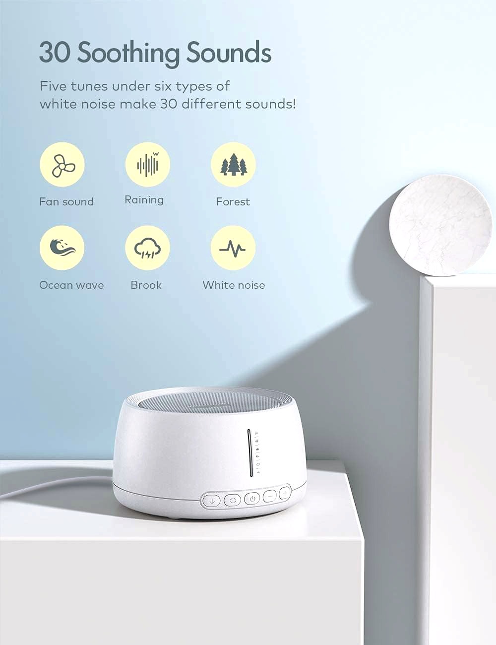 صداهای طبیعی آرامش بخش: 30 نوع صدای طبیعی داخلی، از جمله نویز سفید، صدای فن، باران، رعد و برق، صدای جنگل، جیرجیرک، امواج، جویبارها، ضربان قلب و غیره. میتوانید قبل از خرید، ویدیو را تماشا کنید. 35 سطح صدا برای راحتی شما.