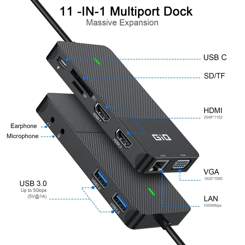 ایستگاه اتصال USB GIQ USB C Hub USB 3.0 به آداپتور دوگانه HDMI VGA سه صفحه نمایش لپ تاپ USB C ایستگاه داکینگ دوتایی نمایشگر سازگار با MacBook M1 USB Dock-Black