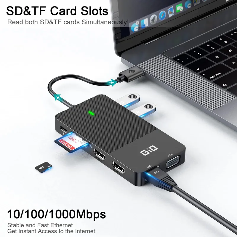 هاب USB-C: آداپتور مک بوک GIQ با HDMI به شما امکان می دهد برای خروجی تصویر واضح به صفحه نمایش یا تلویزیون متصل شوید. با 3 پورت USB می توانید دستگاه ها را شارژ کنید، هارد اکسترنال و صفحه کلید و ماوس را متصل کنید. همچنین یک پورت اترنت 1000 مگابیتی RJ45 گیگابیتی،