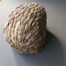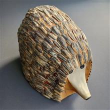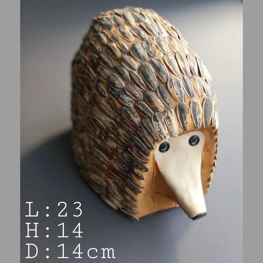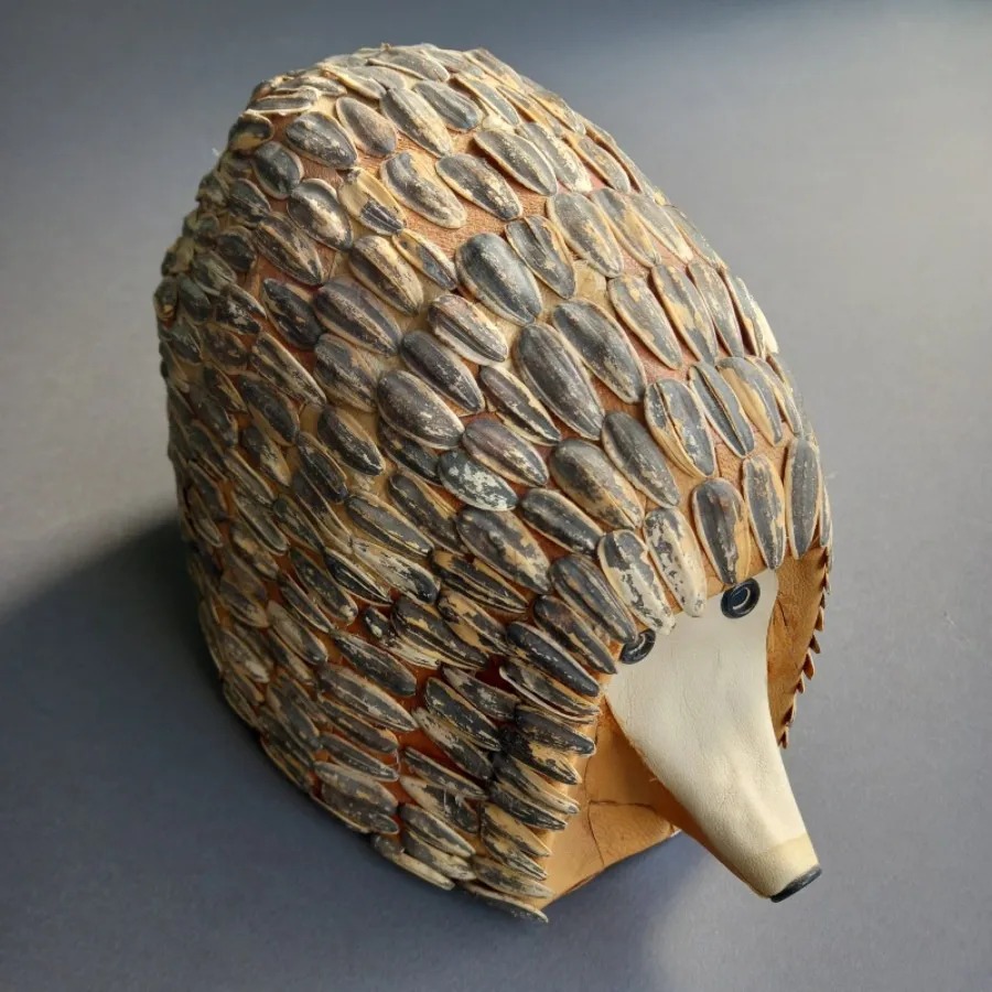 مجسمه مدرن حیوانات طرح خارپشت با لایه ای از تکههای چرم طبیعی پوشش داده شده است و با یک لایه از پوست تخمه آفتابگردان به عنوان خارهای خارپشت تزئین شده است.