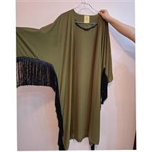 مانتو مجلسی زیتونی ساده سایز s جلو باز استین ها و بغل ها دارای ریش ریش های مشکی. قد بلند تا مچ پا