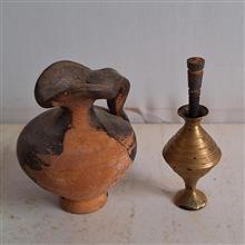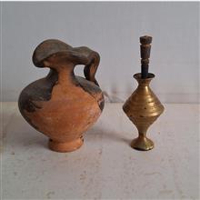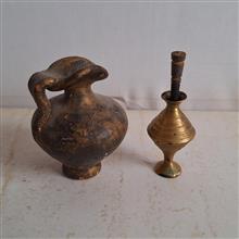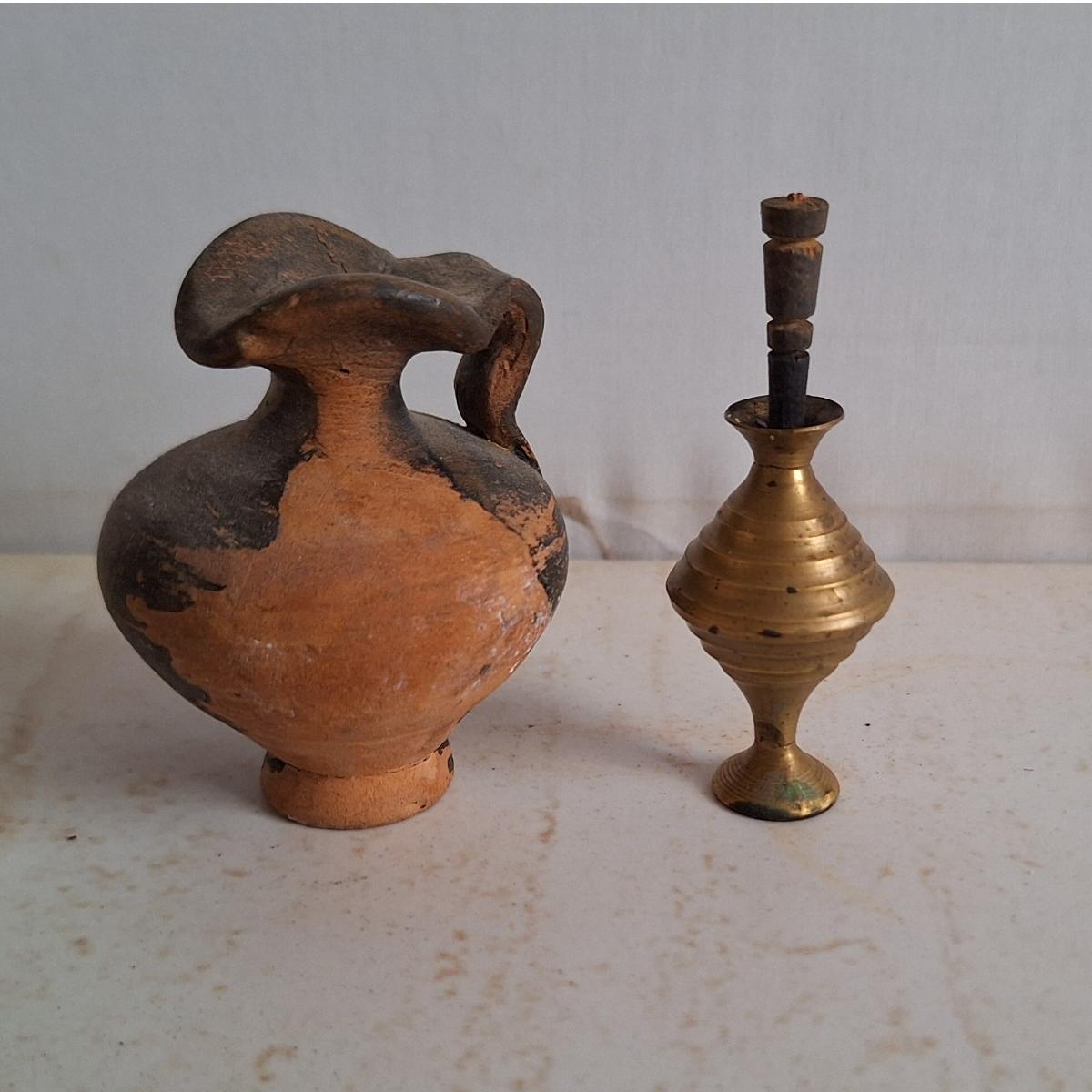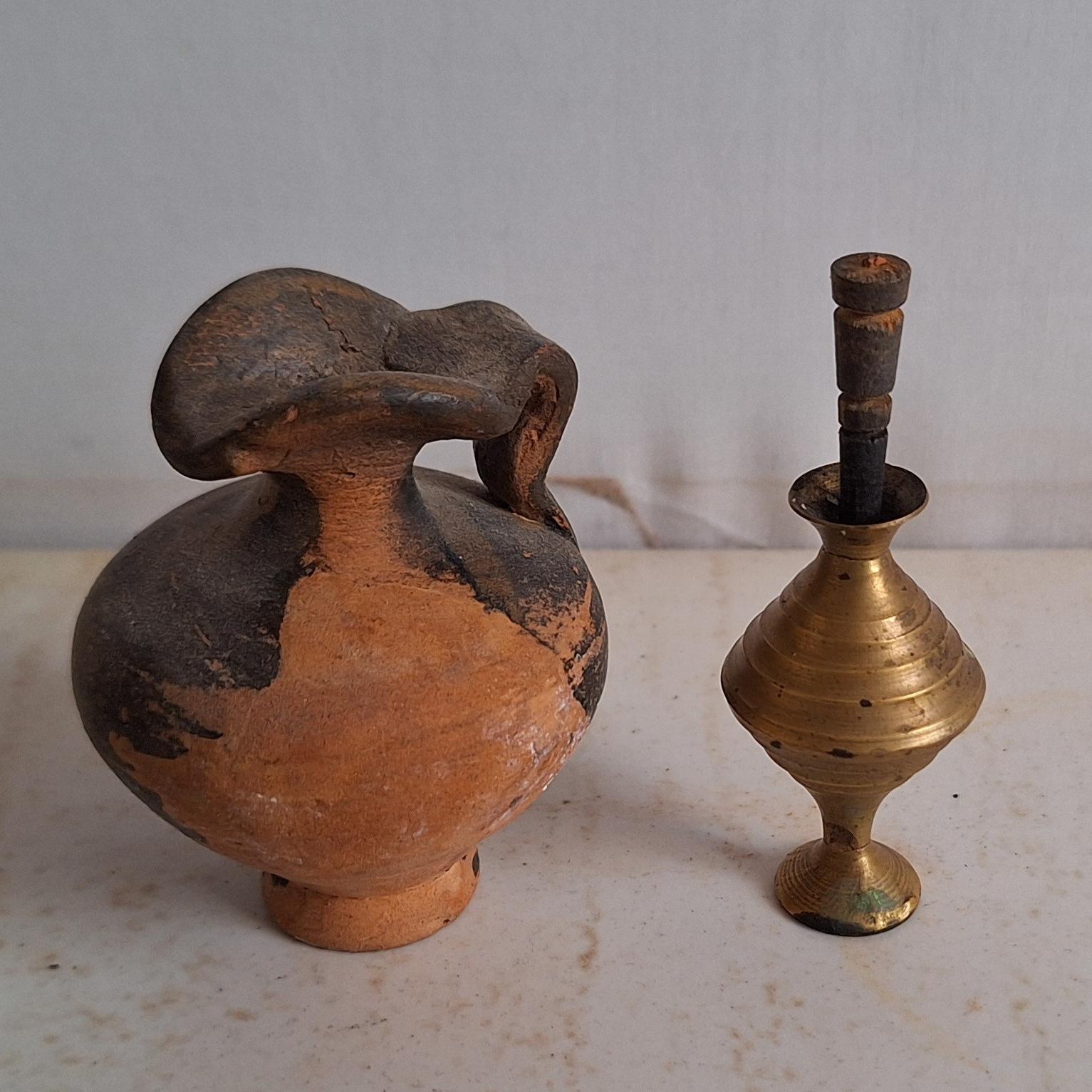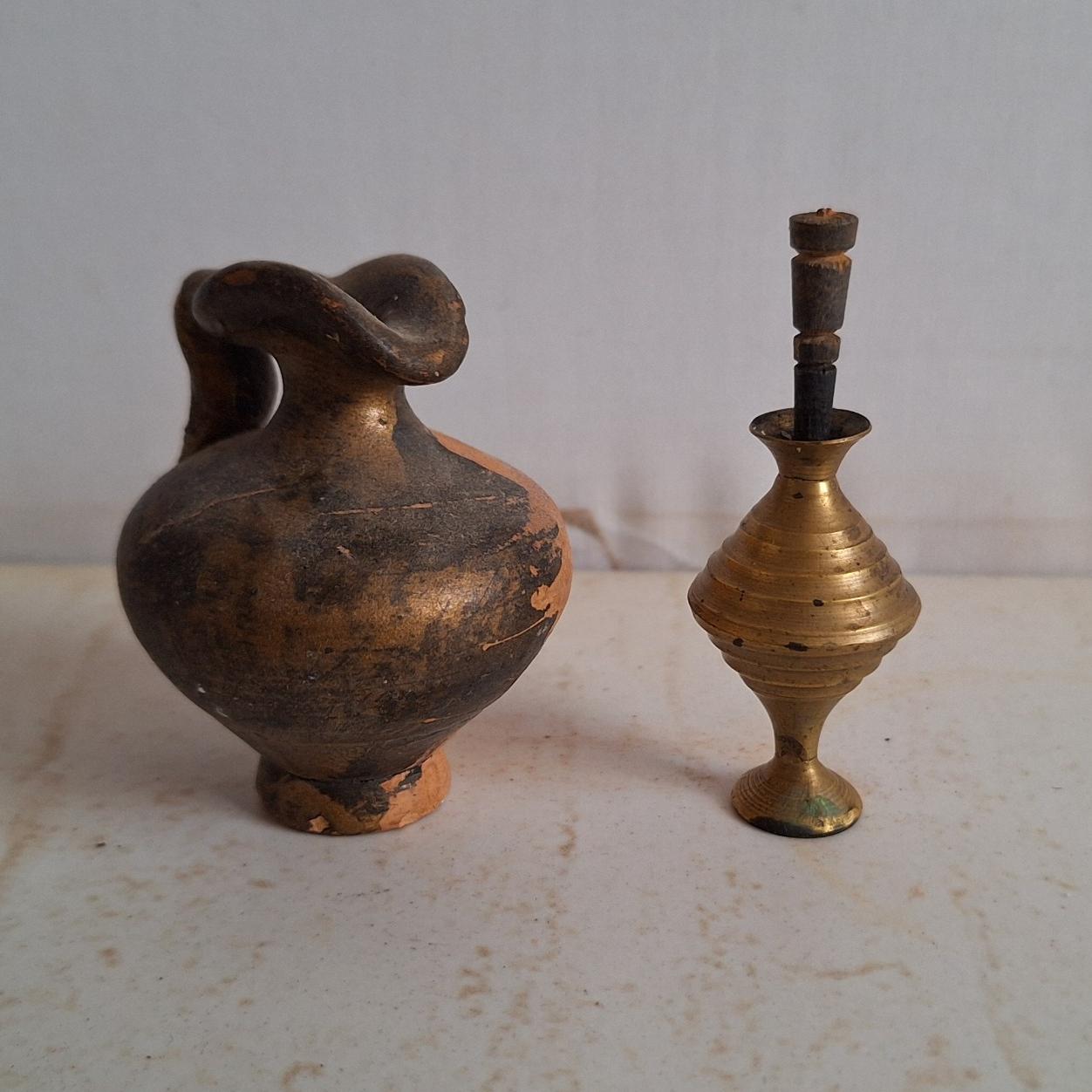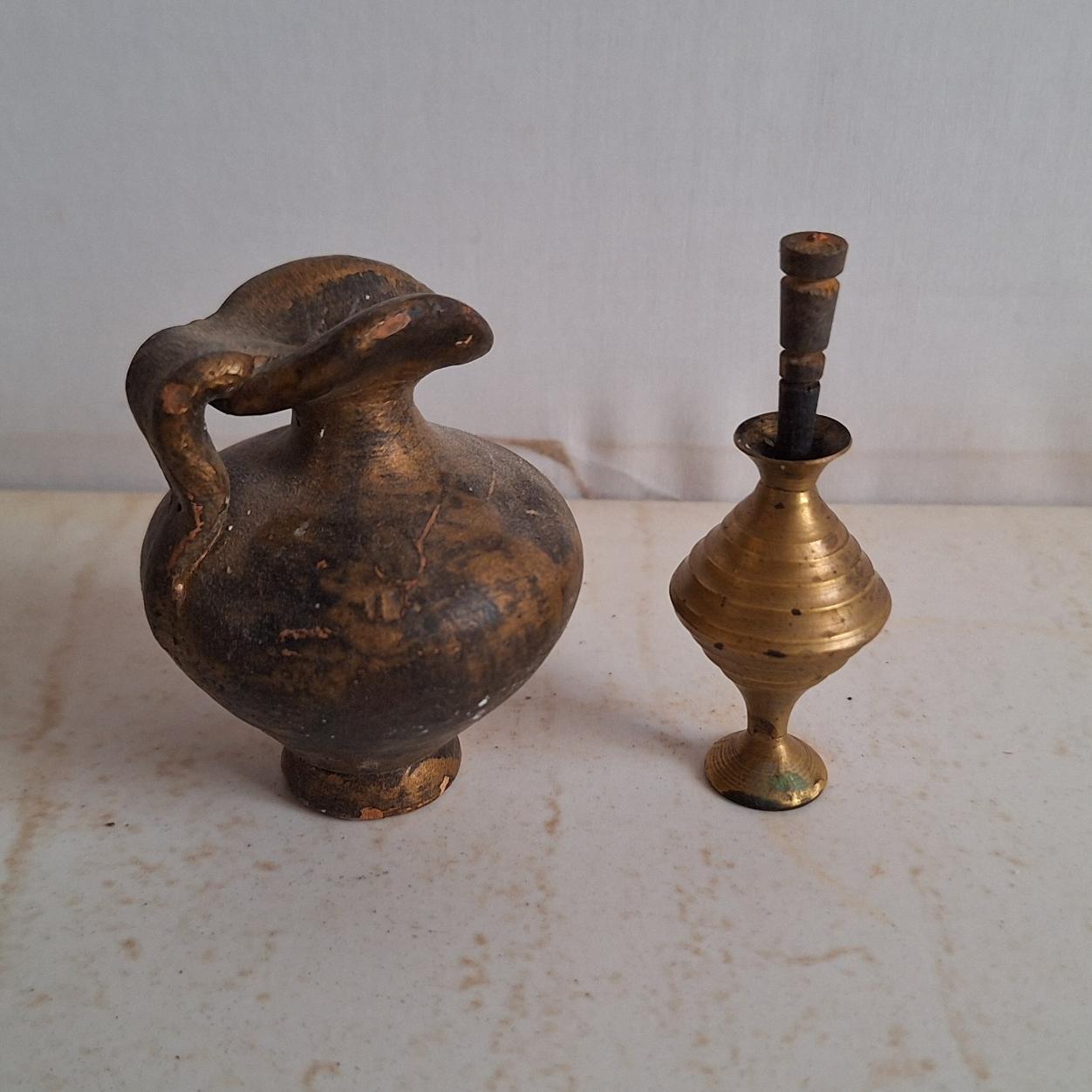 جفت سرمه دان قدیمی یکی برنجی با قلم بالایی ساخته شده از چوب و دیگری درست برابر با تصویر کوزه ای بدون قلم که قابل جایگزینی می باشد ، برنجی ارتفاع 7 سانت و نیم و کوزه ای 7 سانت همگی حدودی .سرمه دان کوزه ای یک سمت آن لک سرمه دارد برابر با تصویر که فکر می کنم قابل به تمیز شدن می باشد . جفت با هم در یک آگهی قیمتگذاری شده است