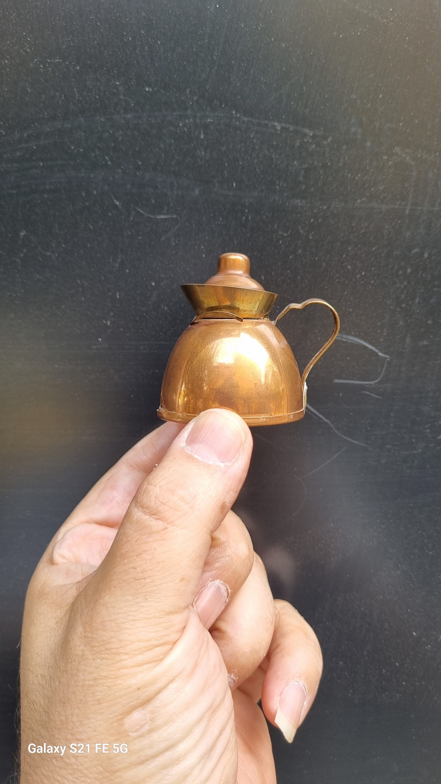 یک قوری مسی تزئینی اروپایی که حک زیر قوری نشاندهنده قدیمی و اروپایی بودن کار را دارد .